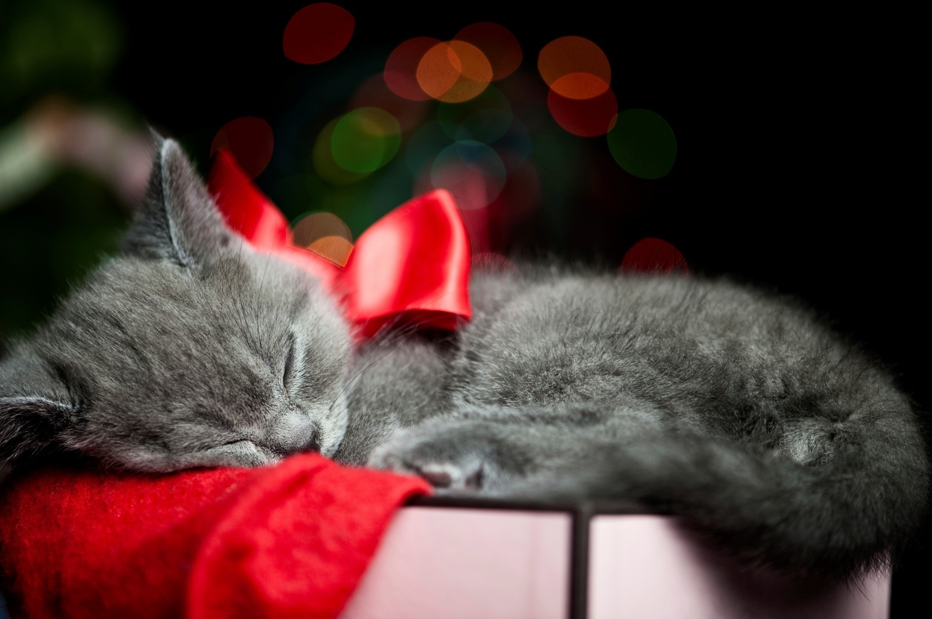 Śliczny szary kotek z czerwoną kokardką śpi w pudełku