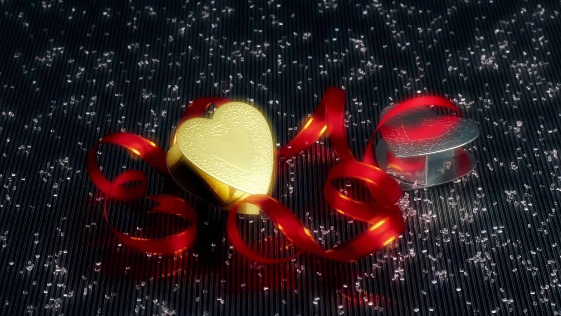 Kartka na Walentynki. Dwa serca na tle kolorowej wstążki