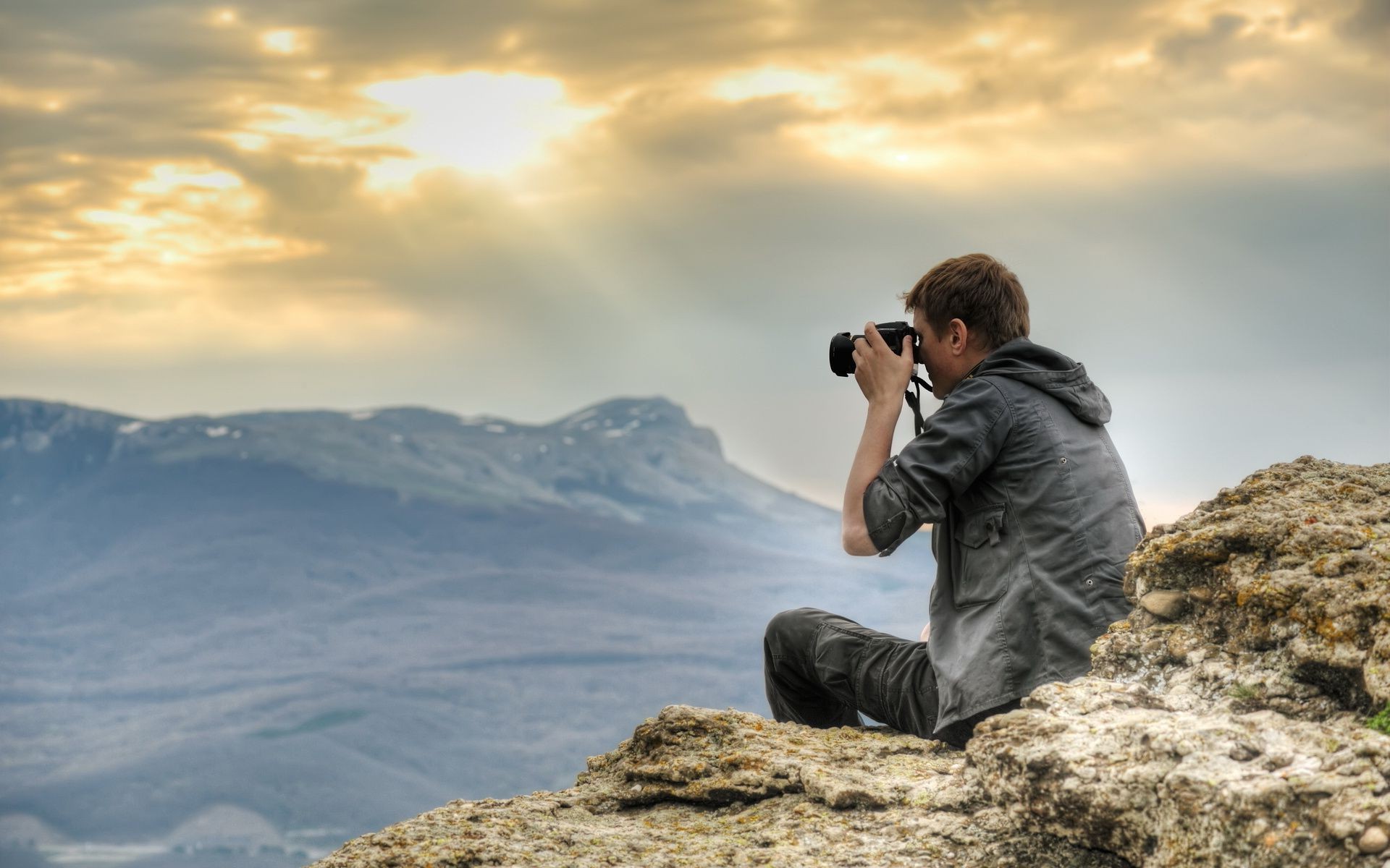 Facet siedzi na skale i strzela do aparatu promienie słońca przechodzące przez chmuryFacet siedzi na skale i strzela do aparatu promienie słońca przechodzące przez chmury