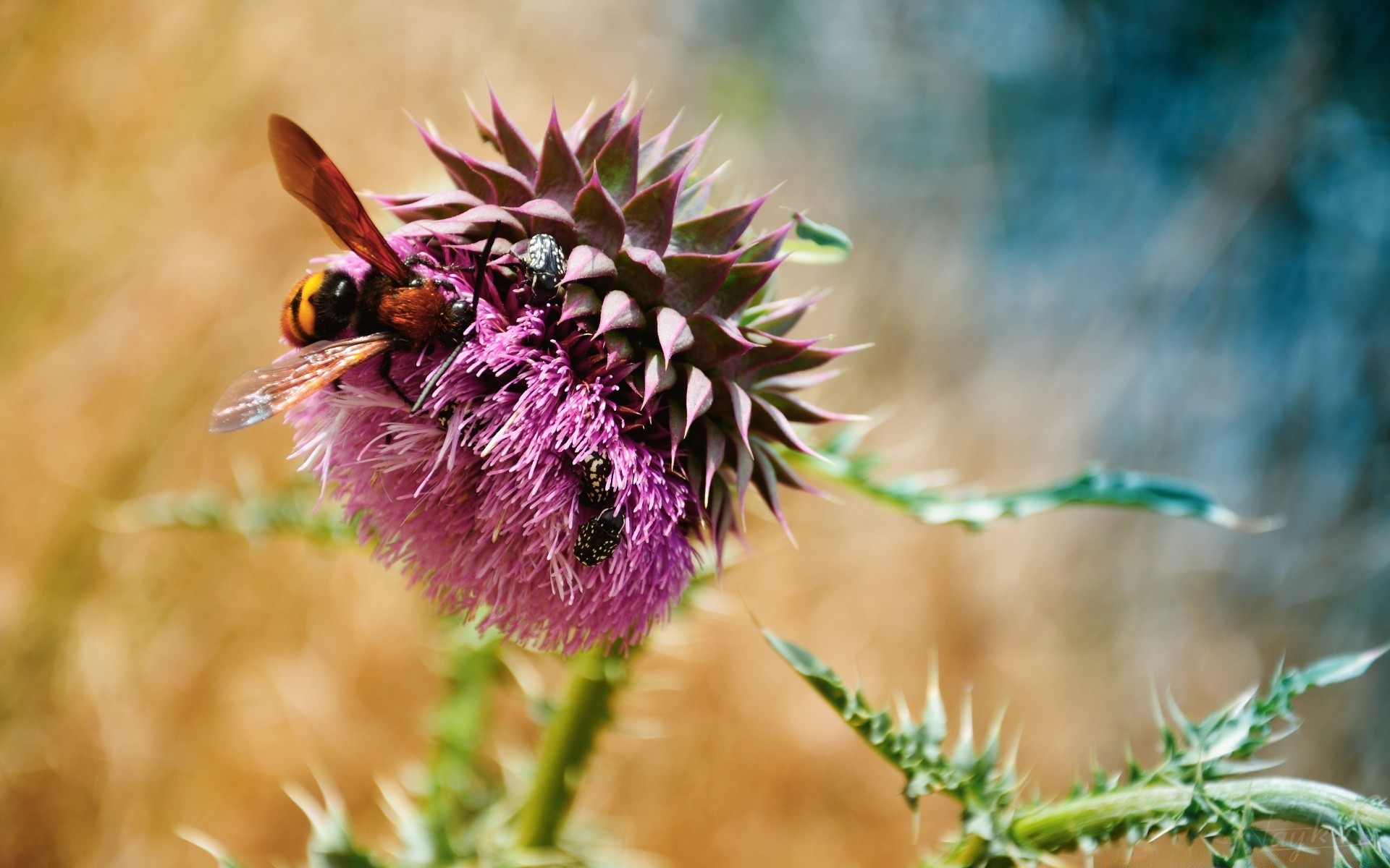 Facet siedzi na skale i strzela do aparatu promienie słońca przechodzące przez chmury