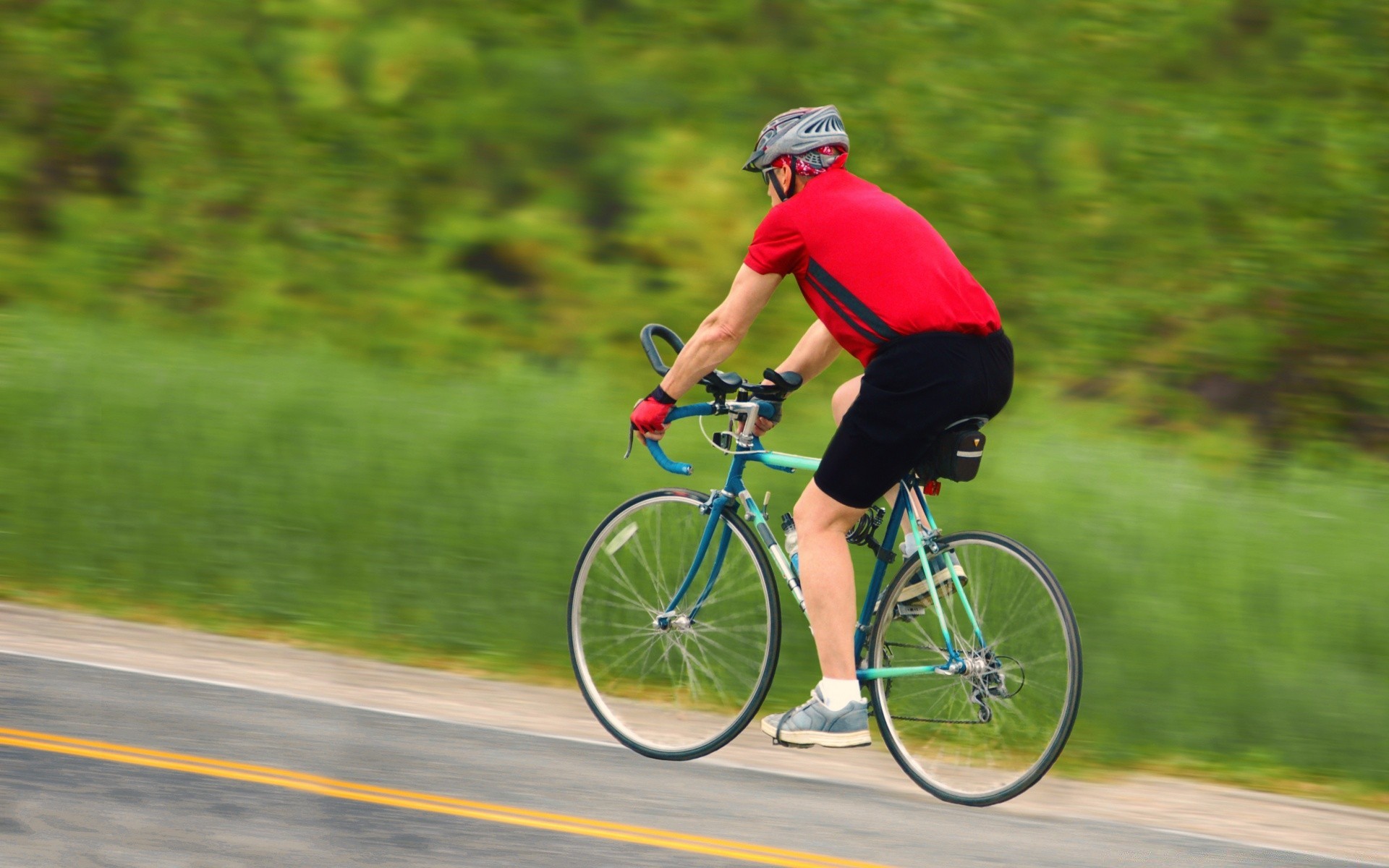 Rowerzysta jedzie szybko po drodze