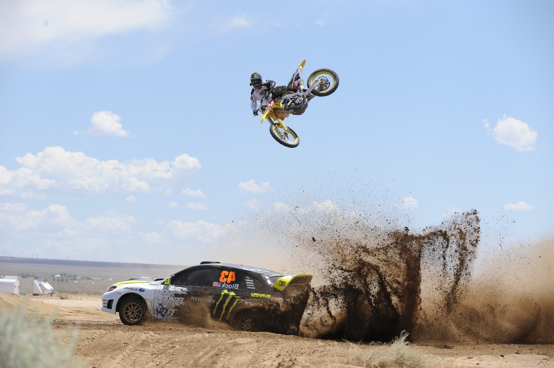 Niesamowity skok na motocyklu w rajdowym samochodzie