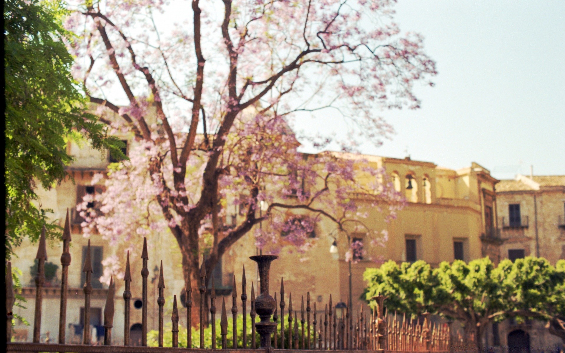 Kwitnące drzewo, stare zdjęcie, piękny budynek