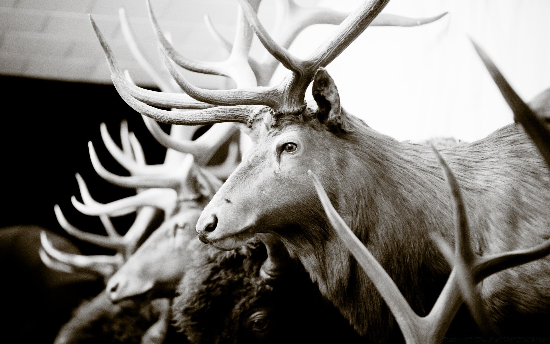 Stado jeleni z rogami na czarno-białym zdjęciu