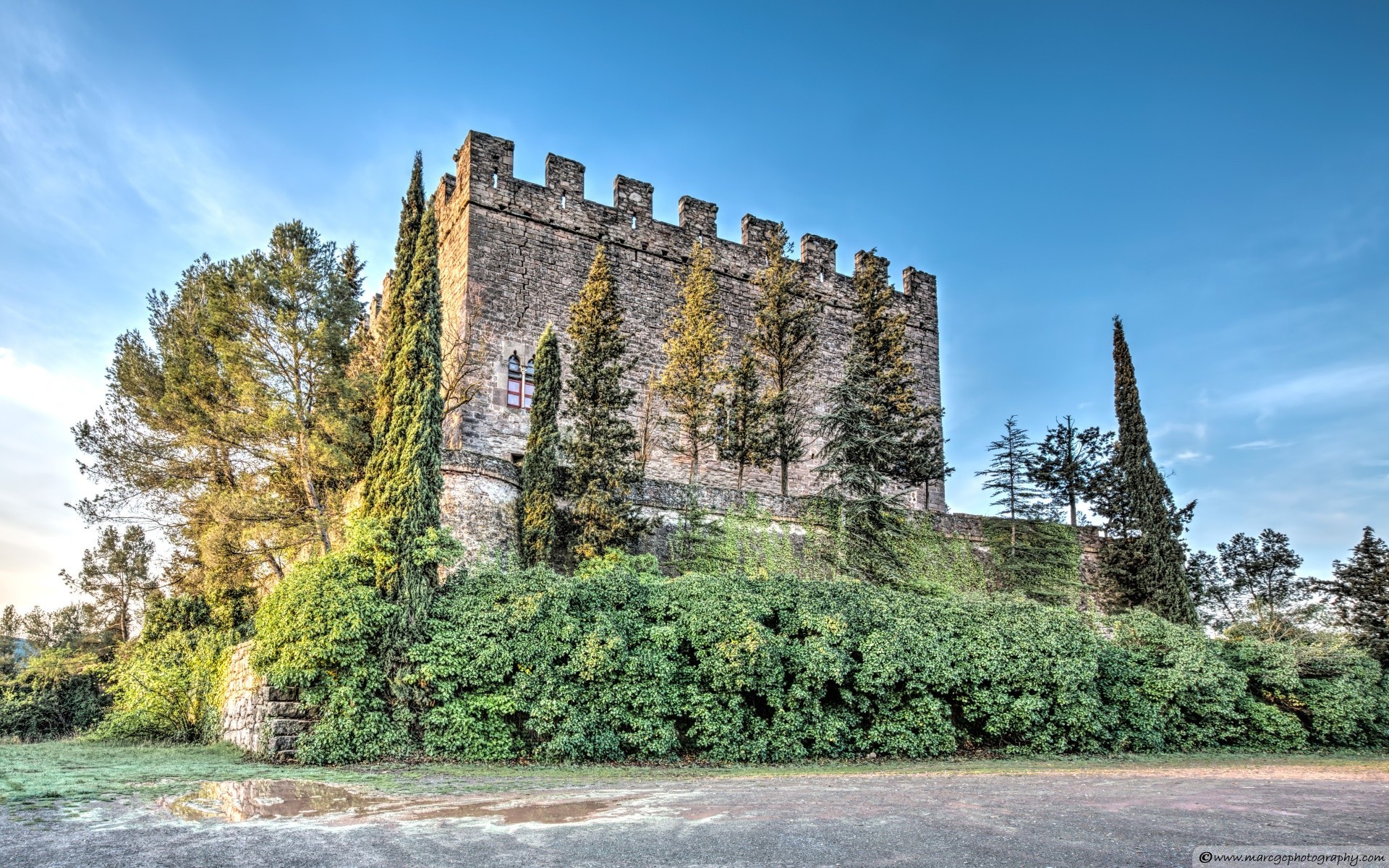 Twierdza otoczona drzewami na brzegu