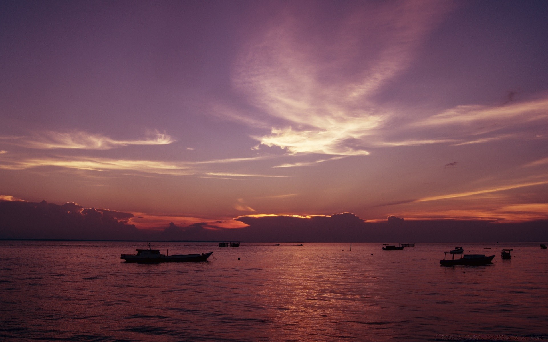 Szkarłatno-fioletowy zachód słońca. Łodzie i statki na morzu