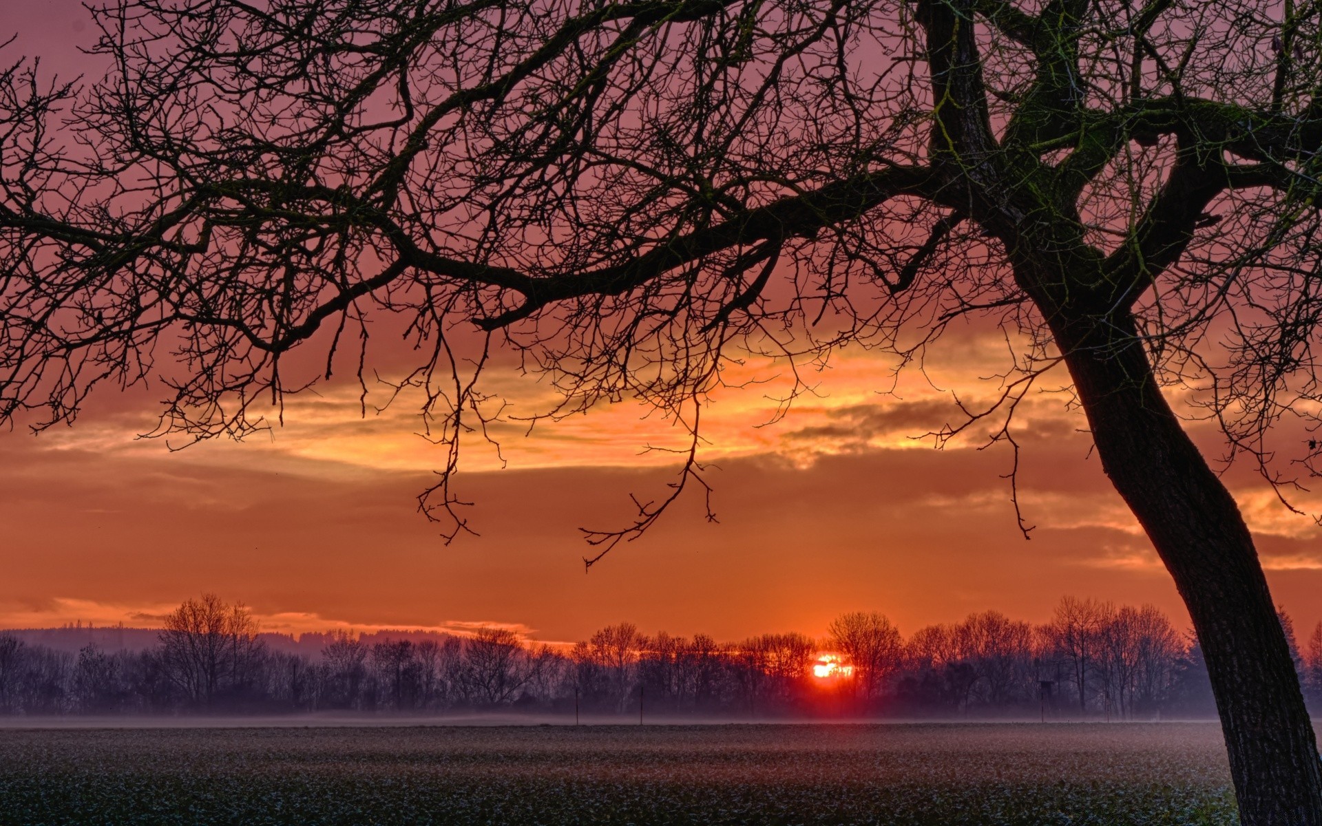 Krajobraz słońce chowa się za drzewem