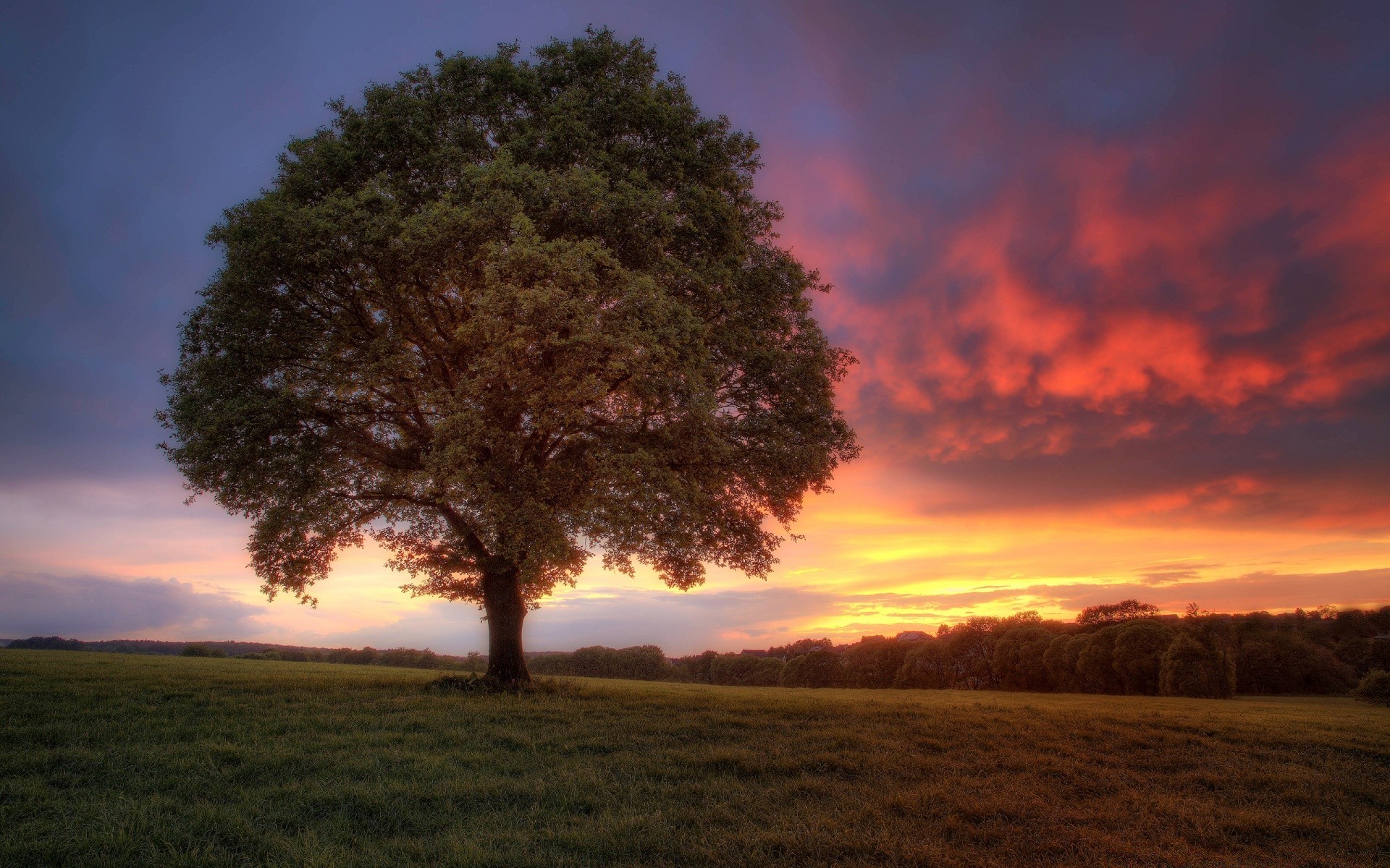 Drzewo we mgle. Świt w polu