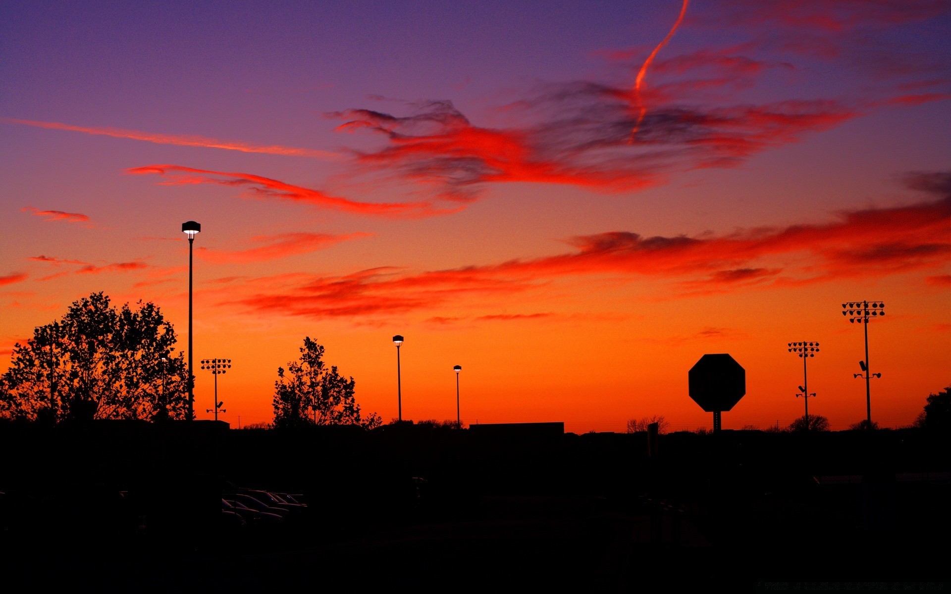 Zachód słońca i ciemne niebo z cieniem z drzewa