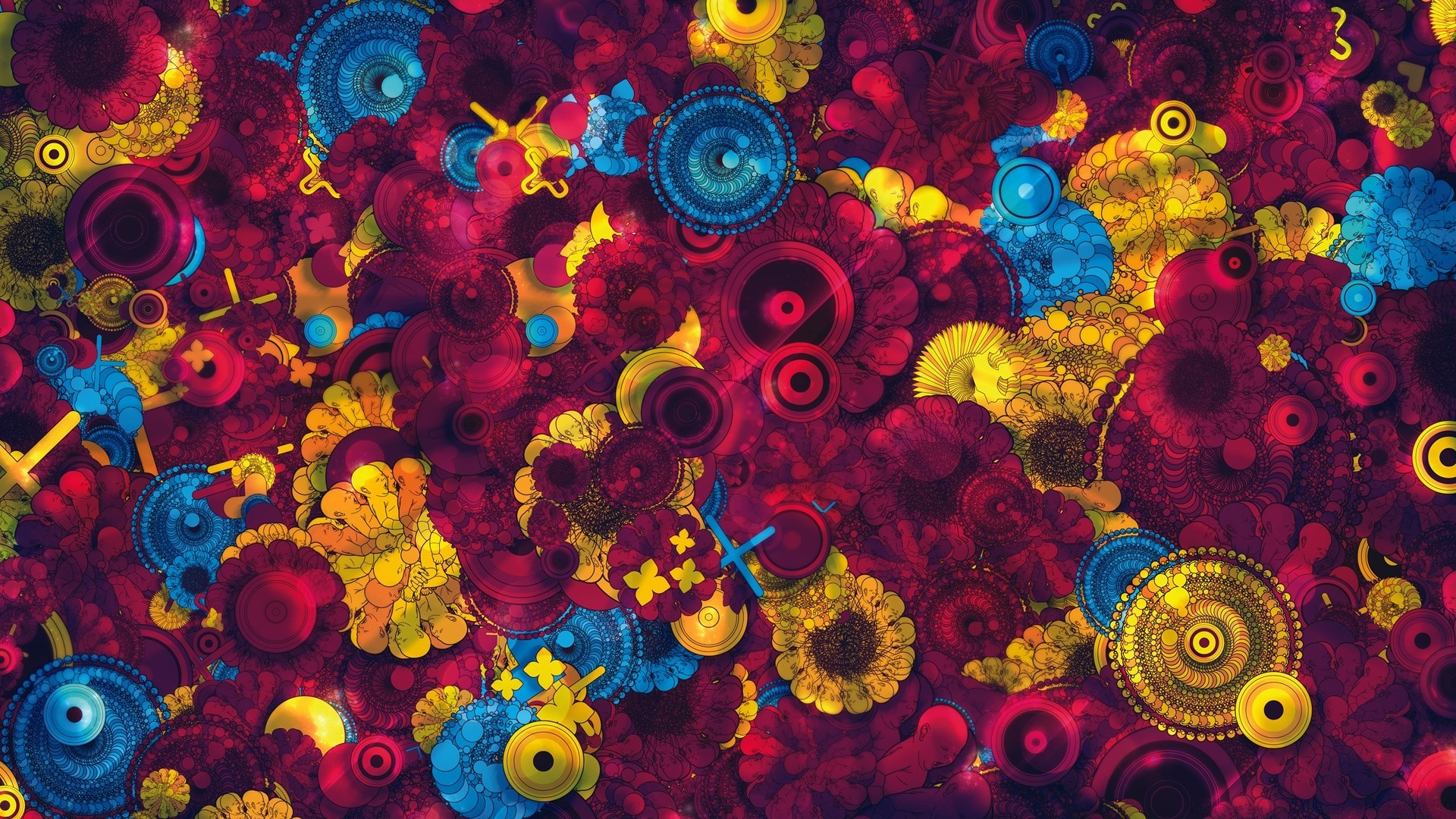 Graficzne przedstawienie wielokolorowych i wieloformatowych plam przypominających zarówno góry, jak i fale w formie aplikacji