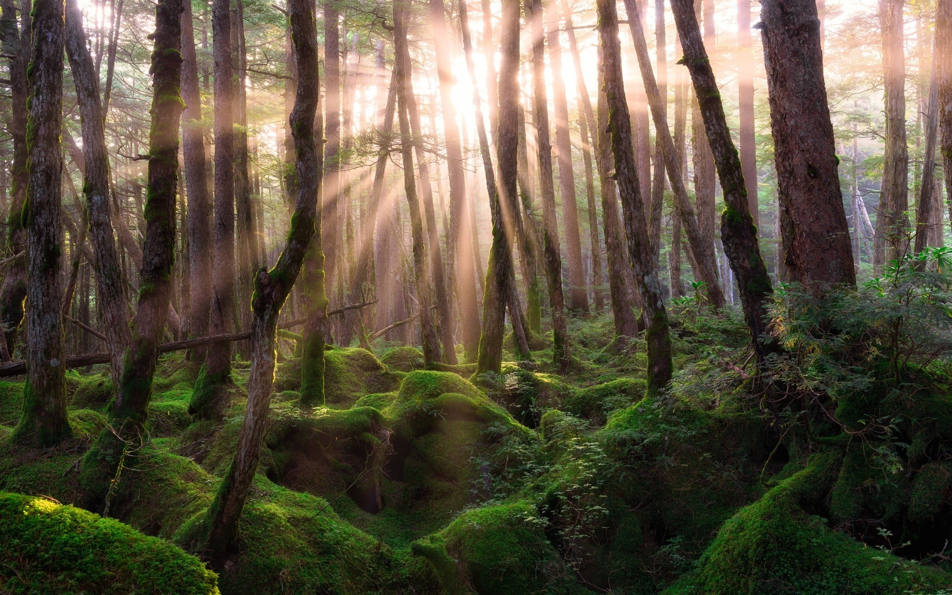 Promienie słońca przebijają się przez las