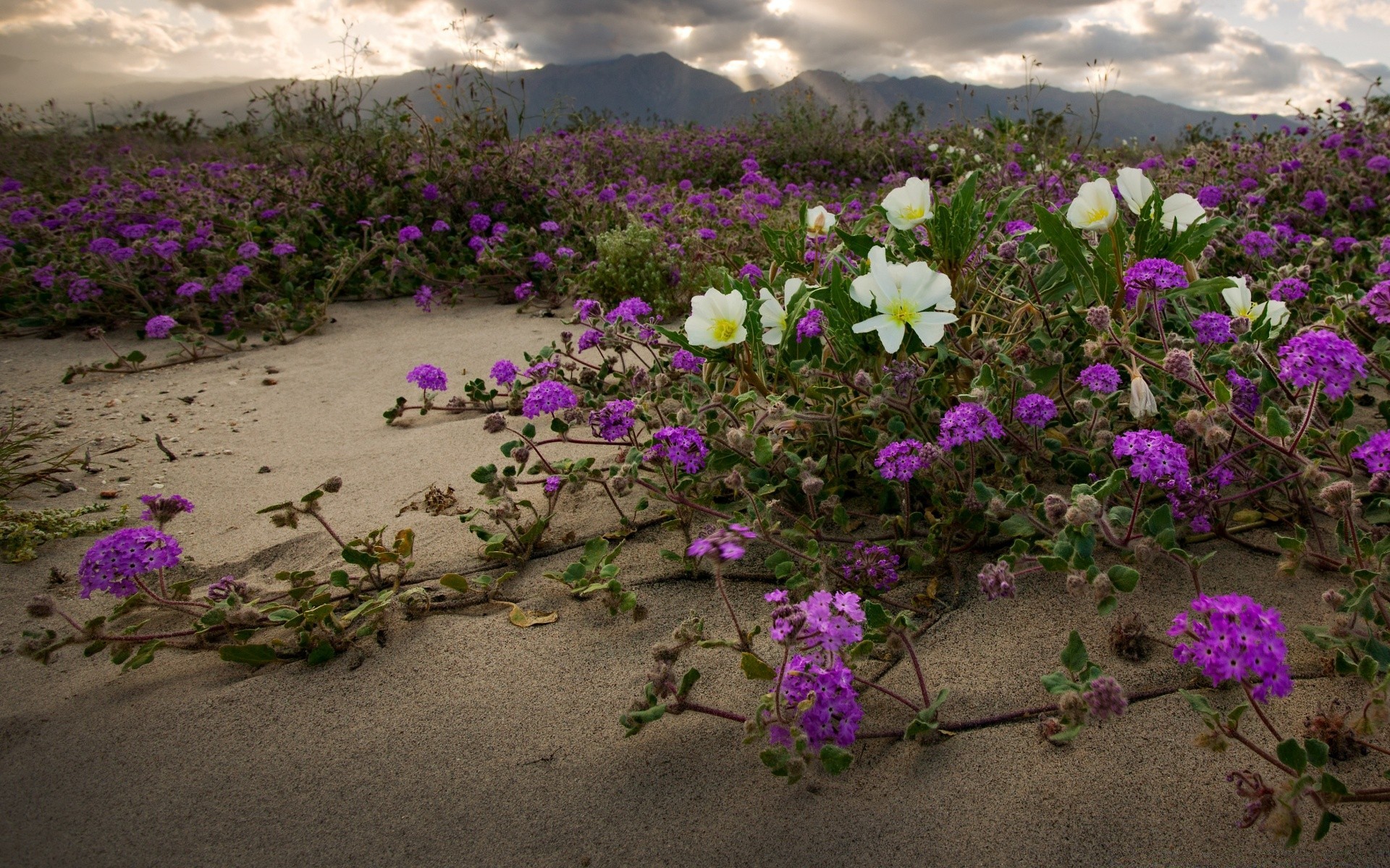 Niezwykłe kwiaty na piasku na tle gór