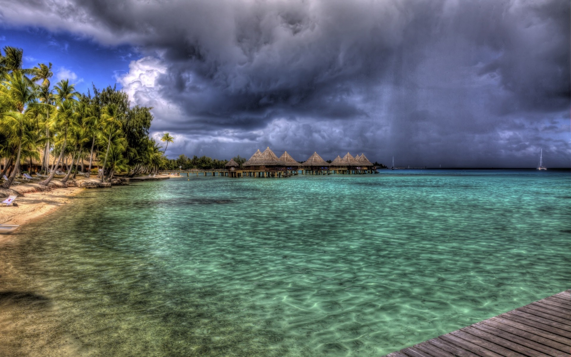 Palmy i chaty na wybrzeżu tropikalnej wyspy