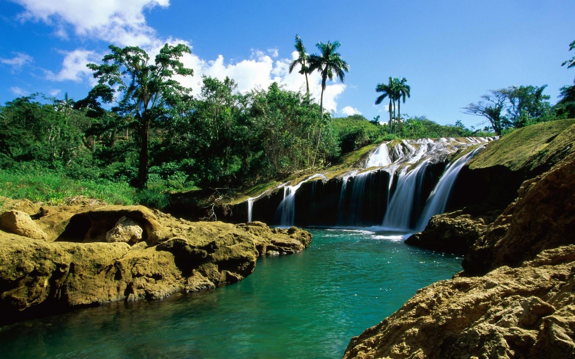 Słoneczne niebo nad białymi plażami i turkusową wodą