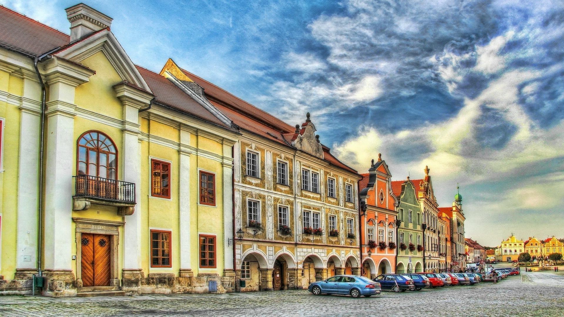 Wielokolorowe parasole wiszą nad ulicą między budynkami na tle błękitnego nieba