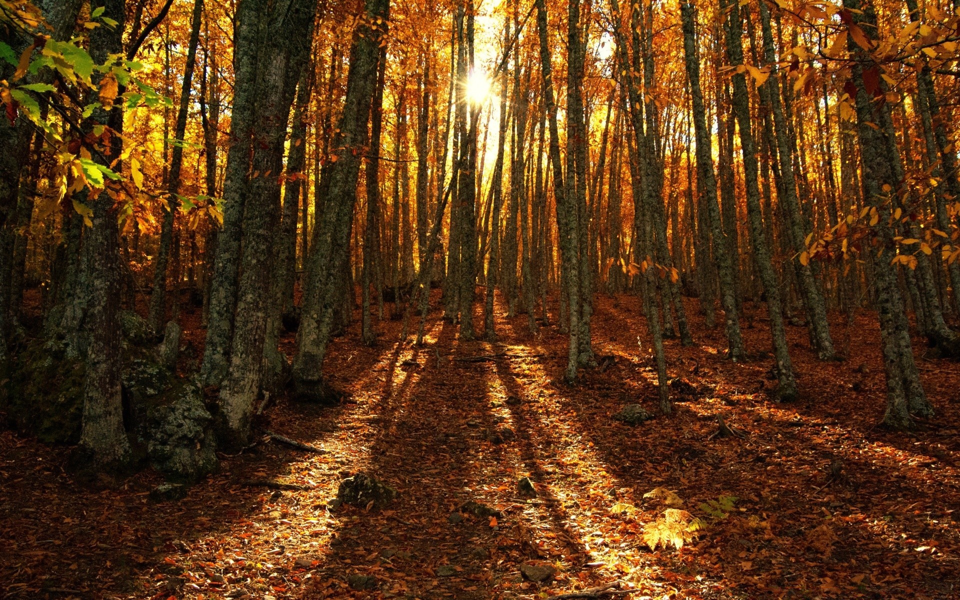 Drzewa z prostymi, równymi pniami w zielonym lesie