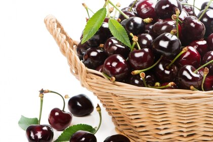 Kosz dojrzałych wiśni z listkiem