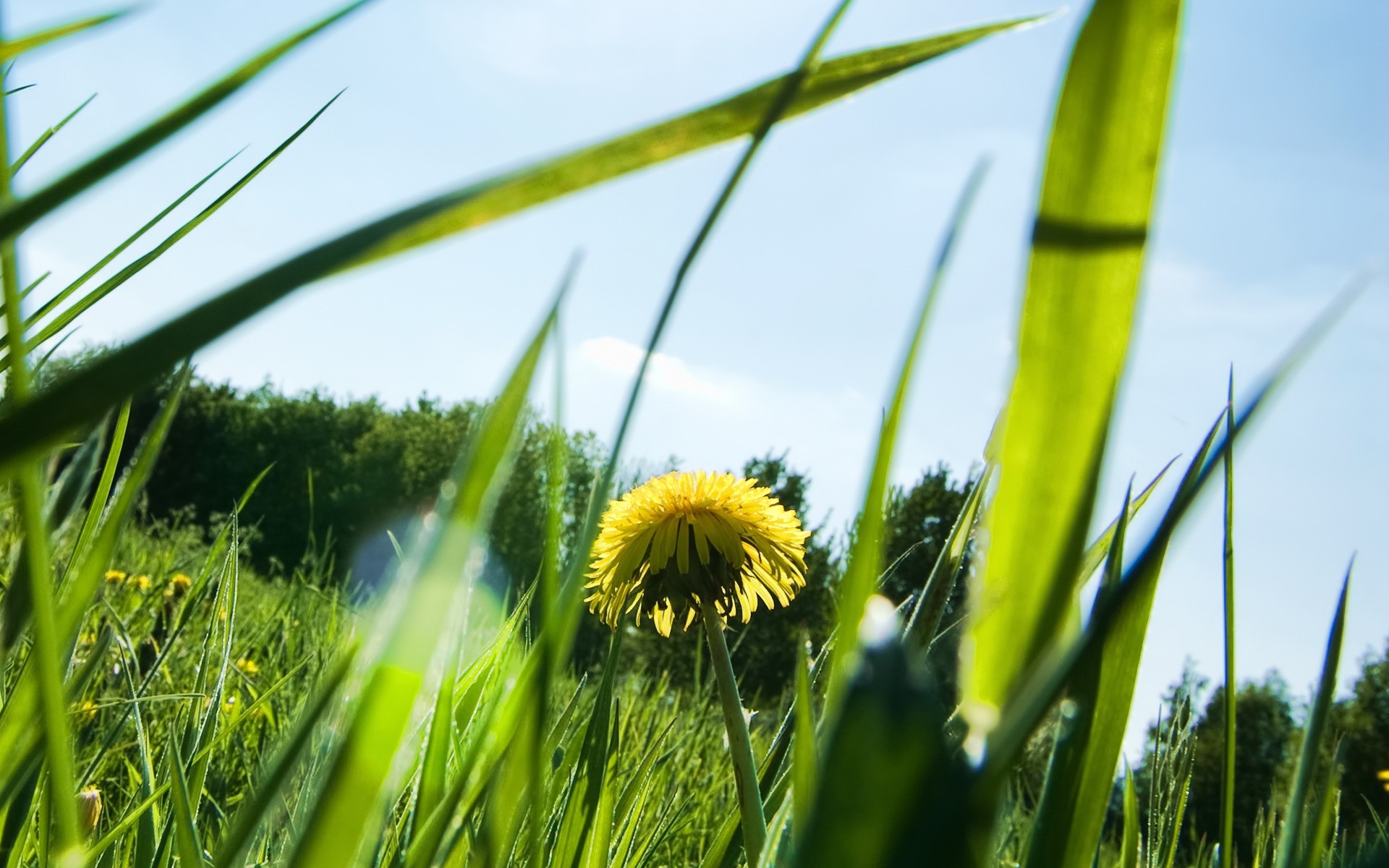 Mniszek lekarski otoczony trawą i drzewami