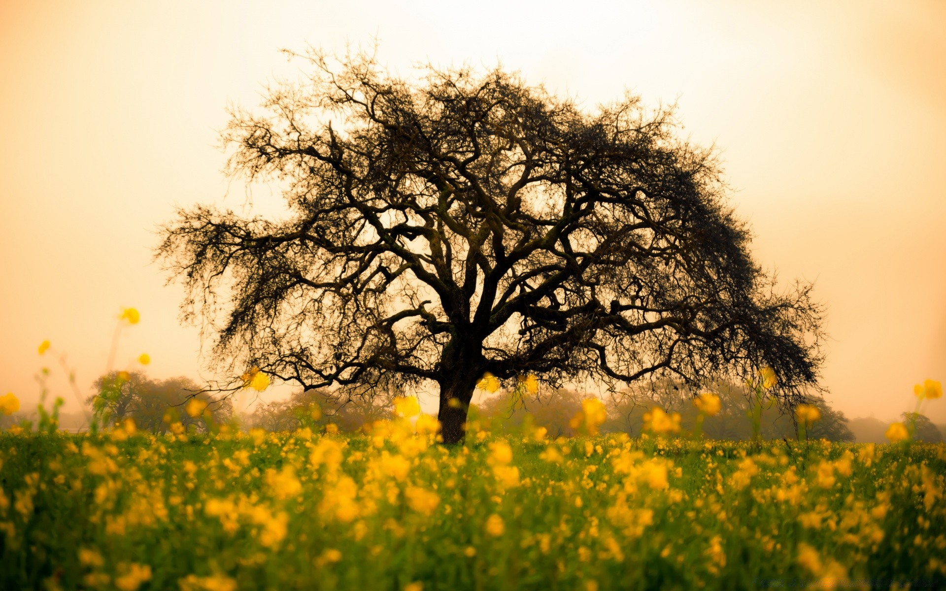 Wiosenne pole kwiatów o świcie