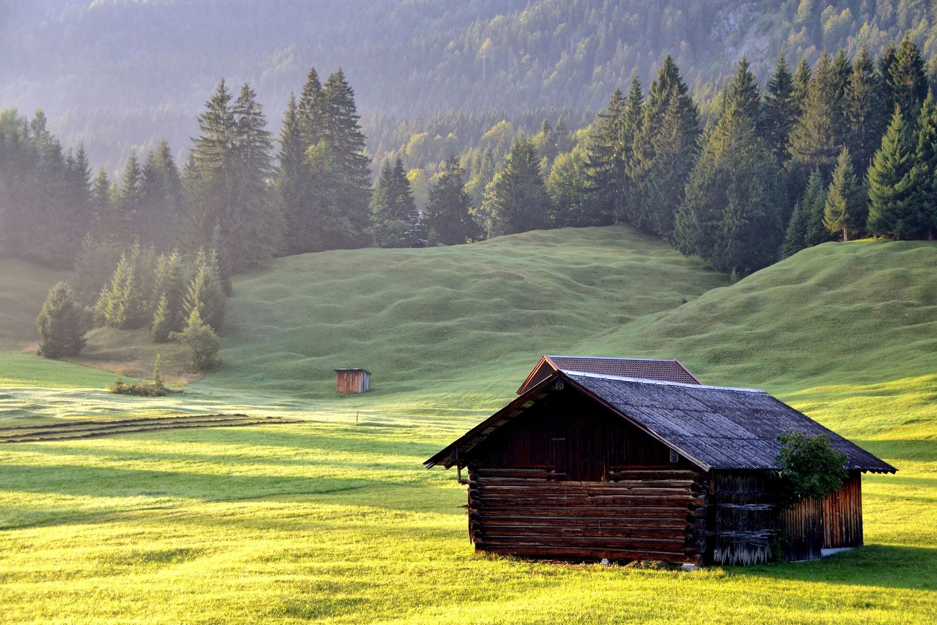 Pole skoszonej trawy zebrane w bele o zachodzie słońca