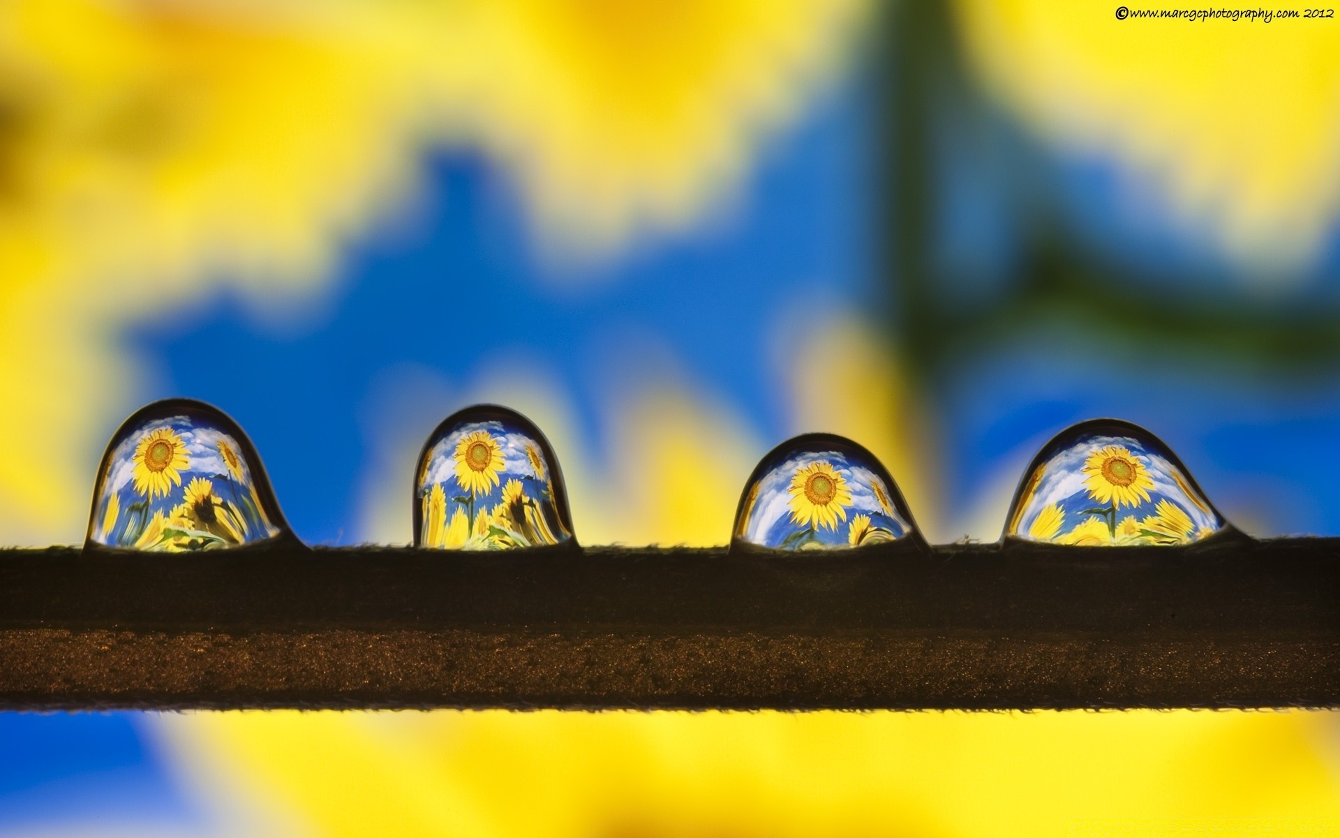Obraz w kropli. Makrofotografia. Słonecznik w kropli