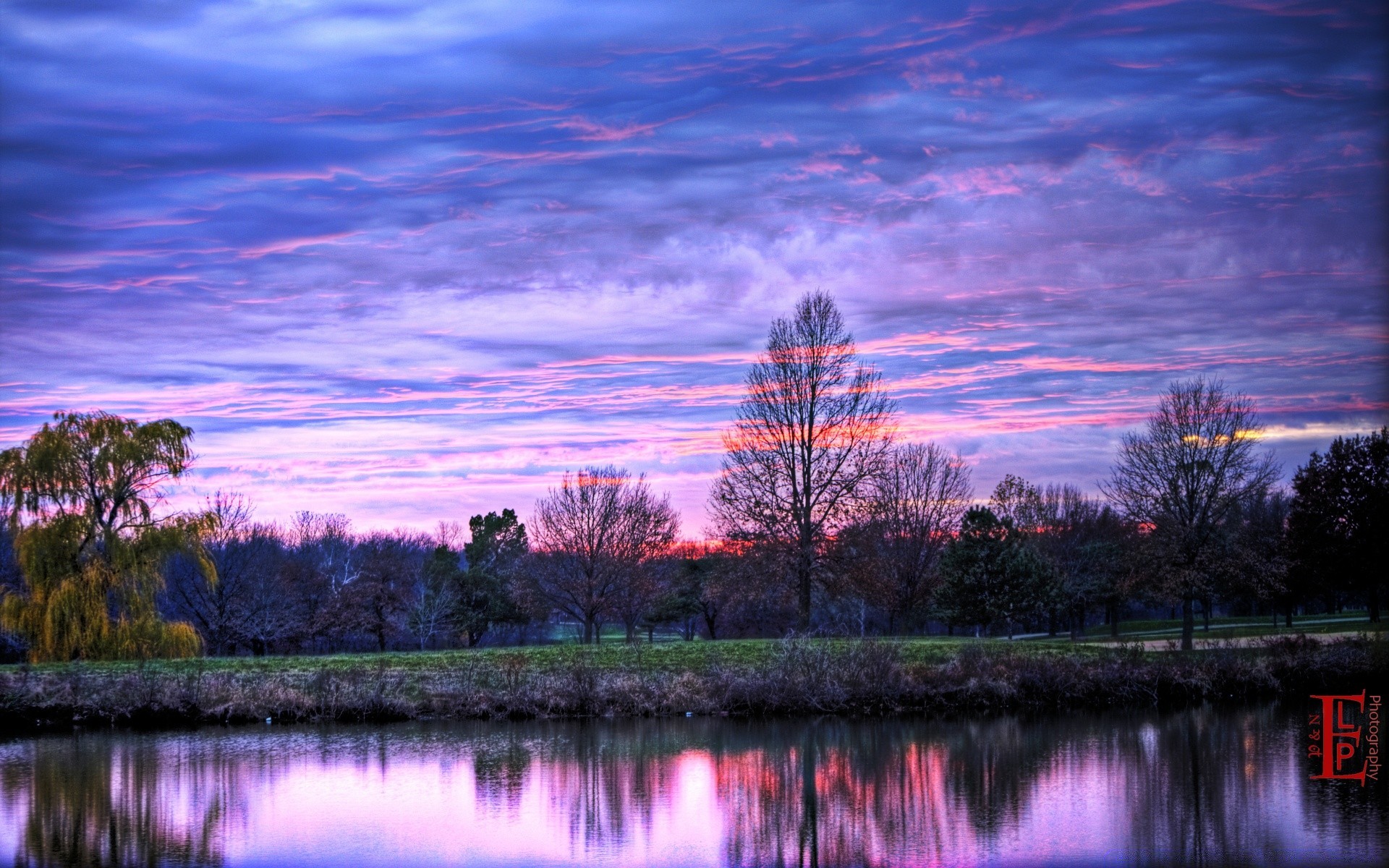 Krajobraz jezioro las trawa niebo chmury
