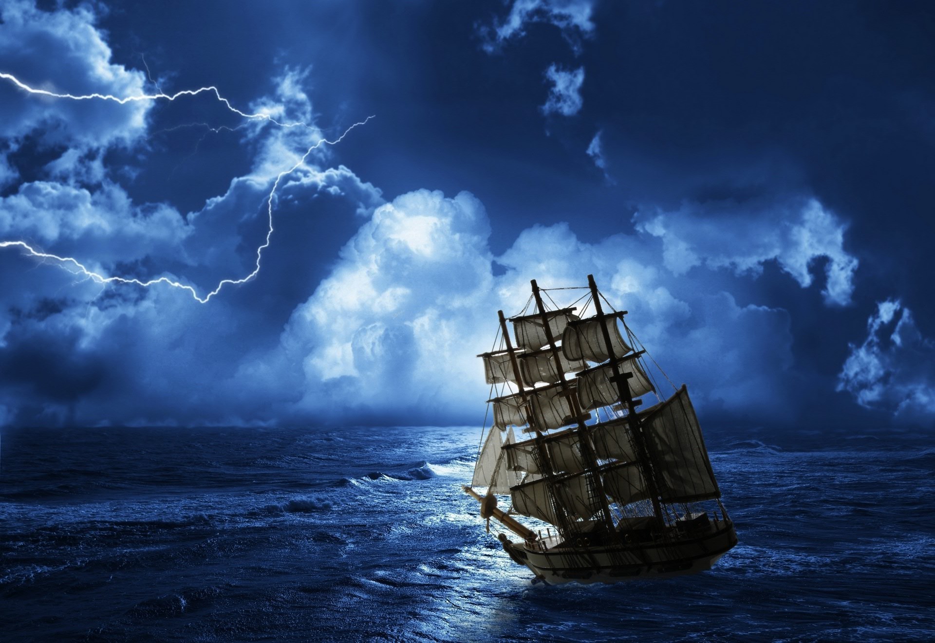 Abstrakcja i grafika. Sztorm. Statek na środku oceanu