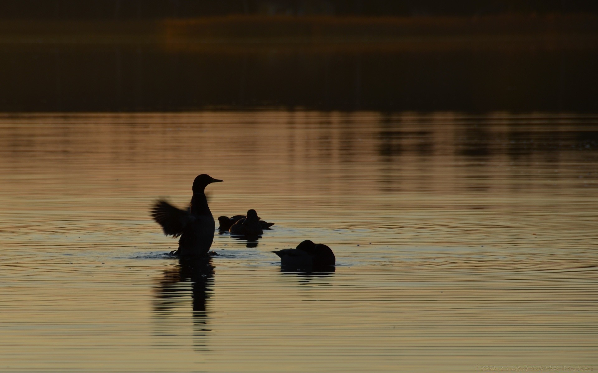 Kaczki na jeziorze o zachodzie słońca widać odbicie