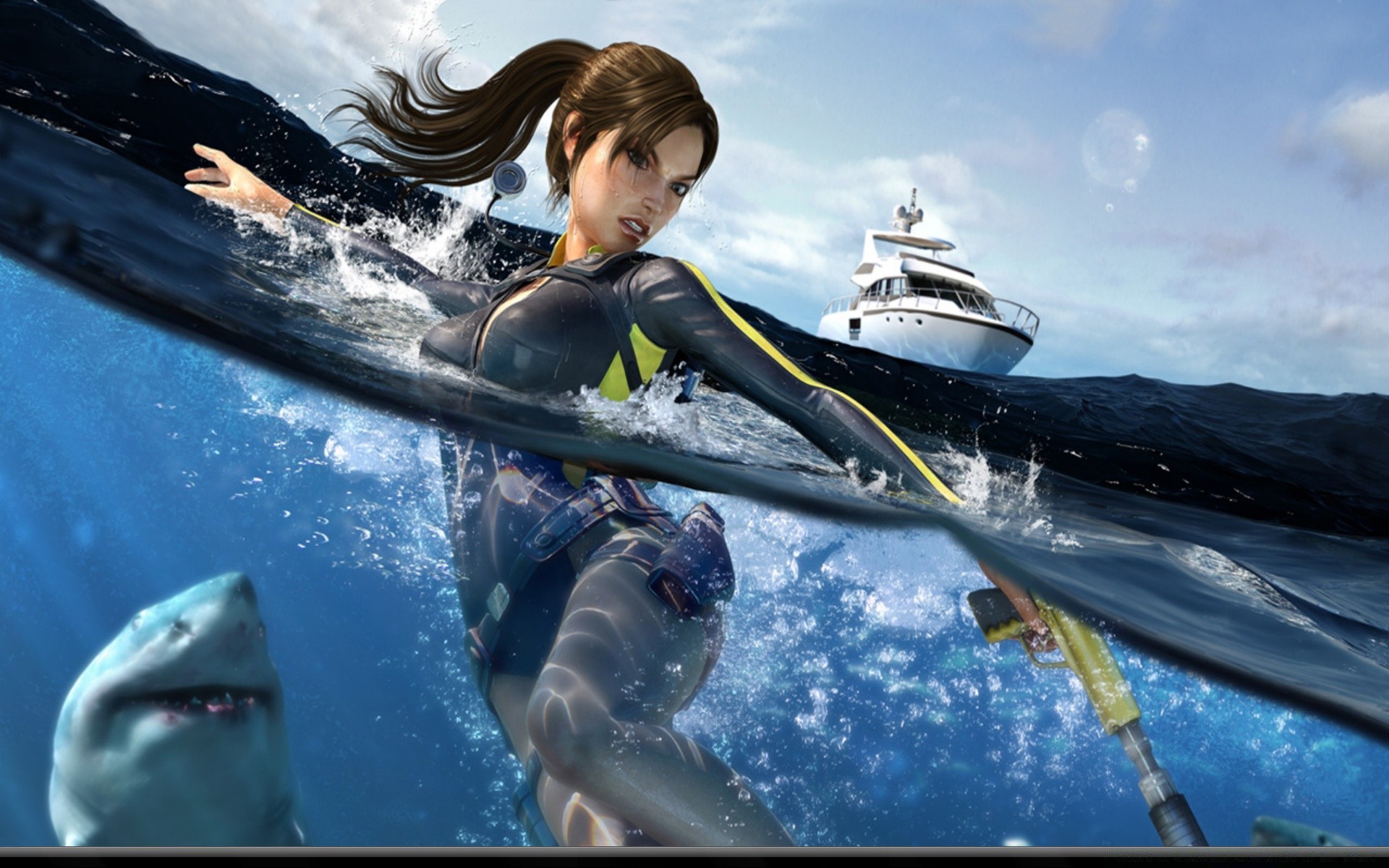 Dziewczyna pływa na pełnym morzu, w pobliżu rekina
