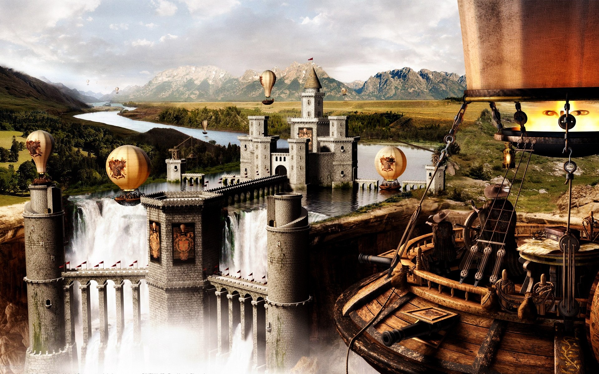 FANTASY. Zamek na górze. Kaskada. Mgła