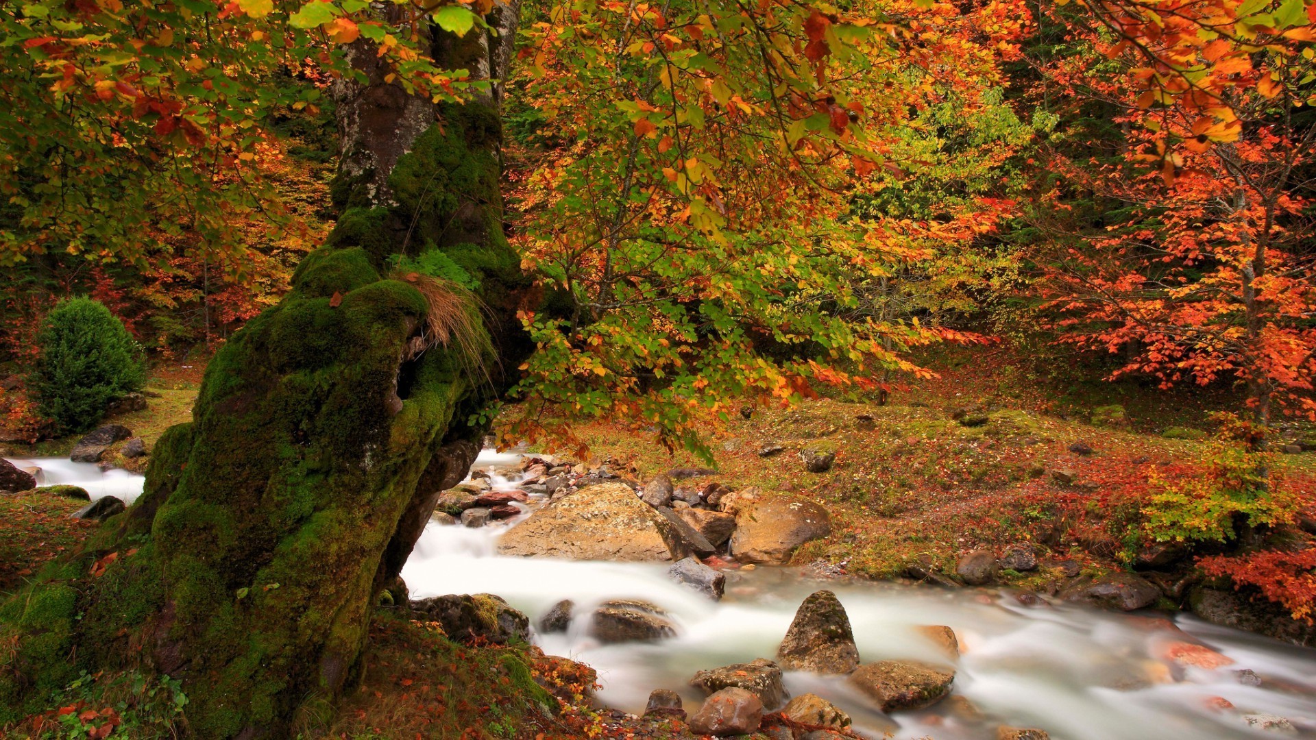 Jesień las wodospad kamienie