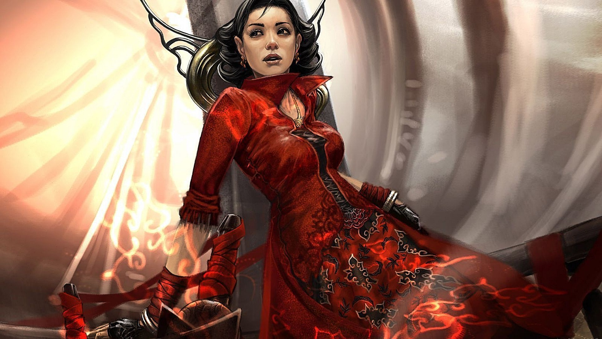 Ilustracja dziewczyna-wojownik w czerwonej sukience
