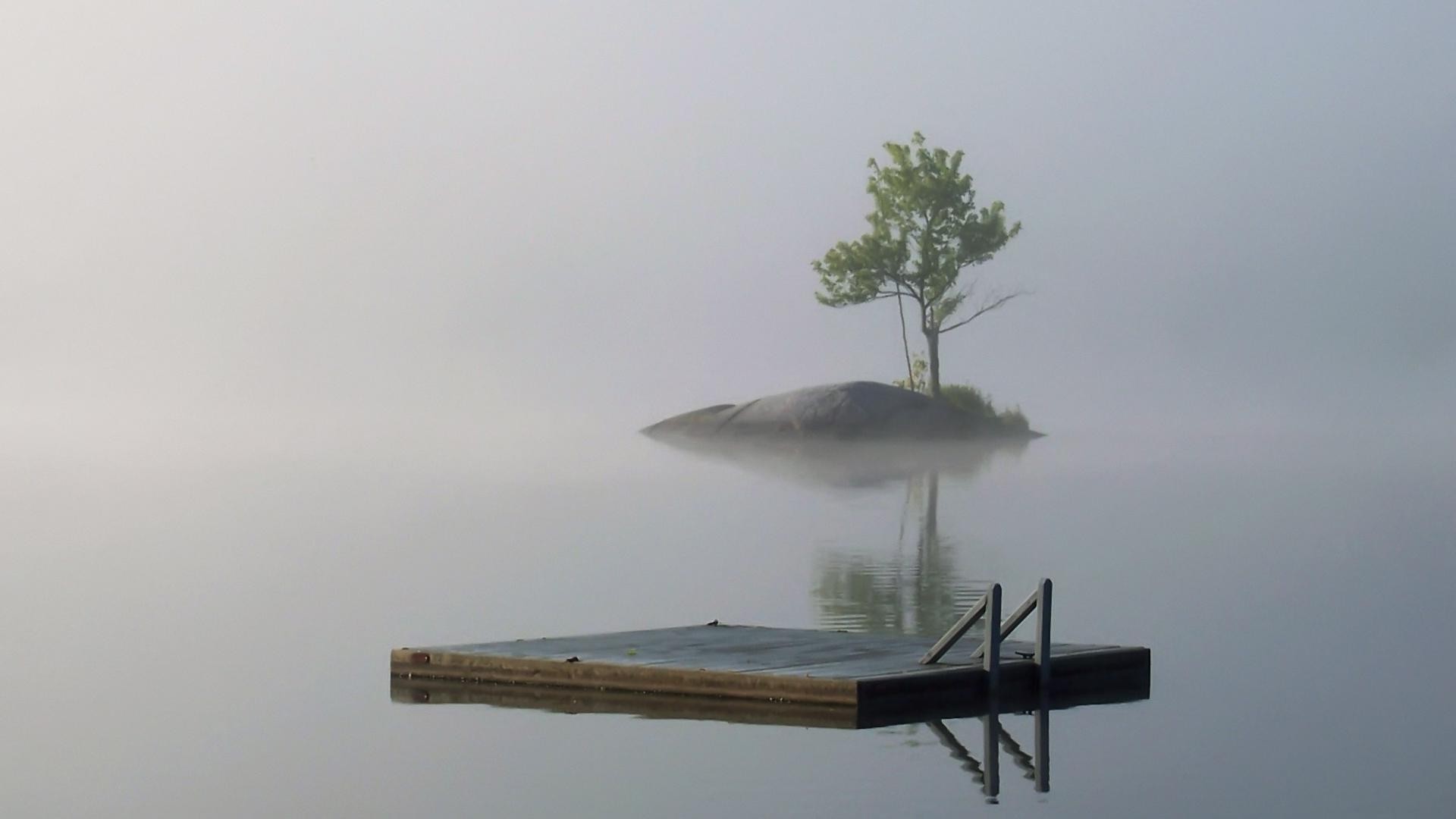 Zamek we mgle. Wyspa we mgle. Bajkowy krajobraz