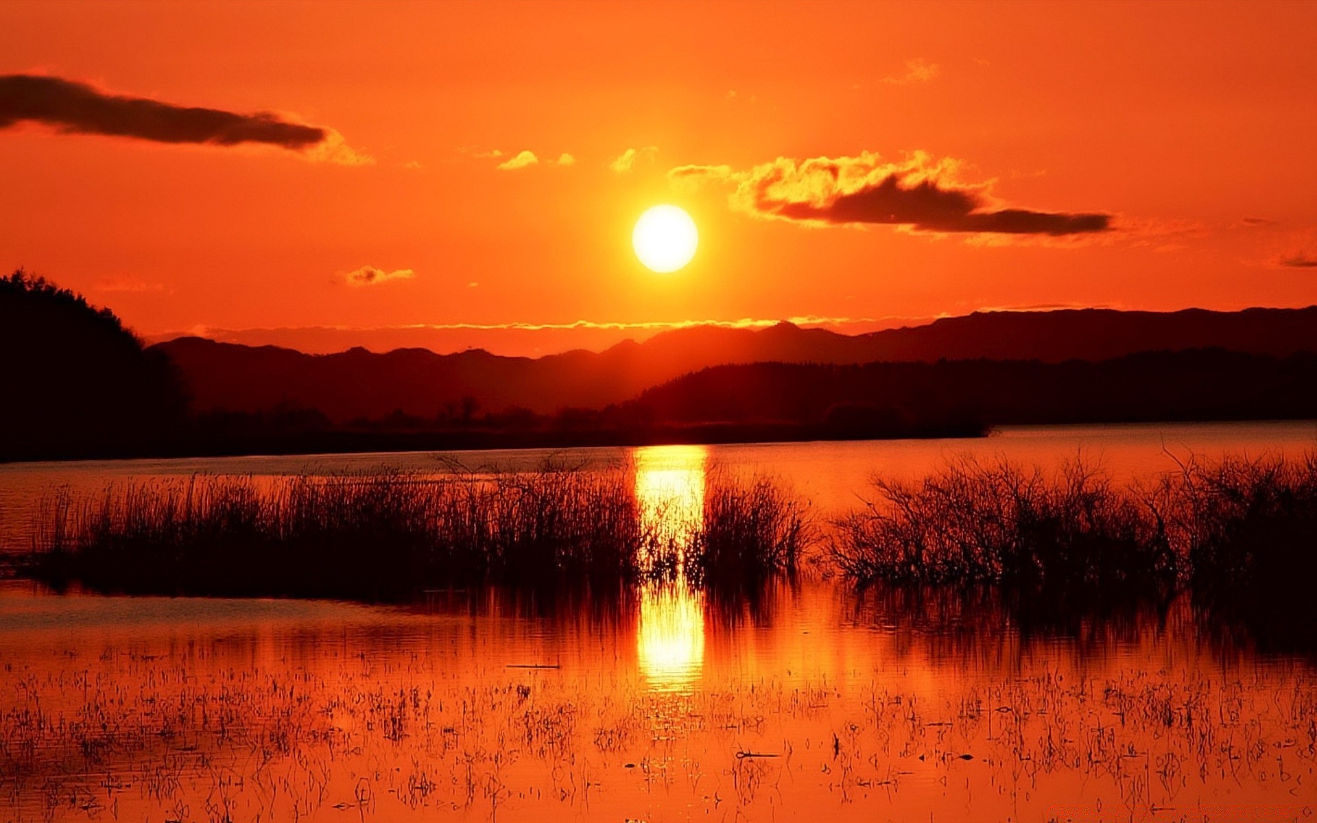 Zachód słońca na tle ognistego pomarańczowego nieba