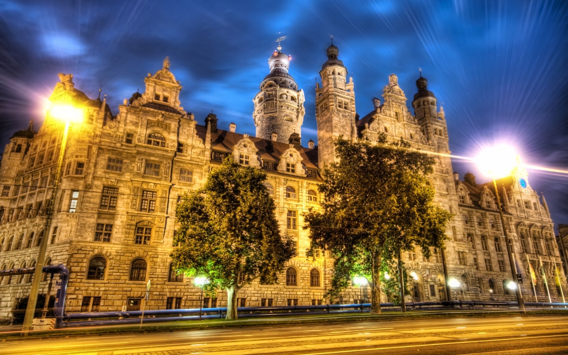 Nocny zabytkowy zamek w świetle latarni przyjmuje gości