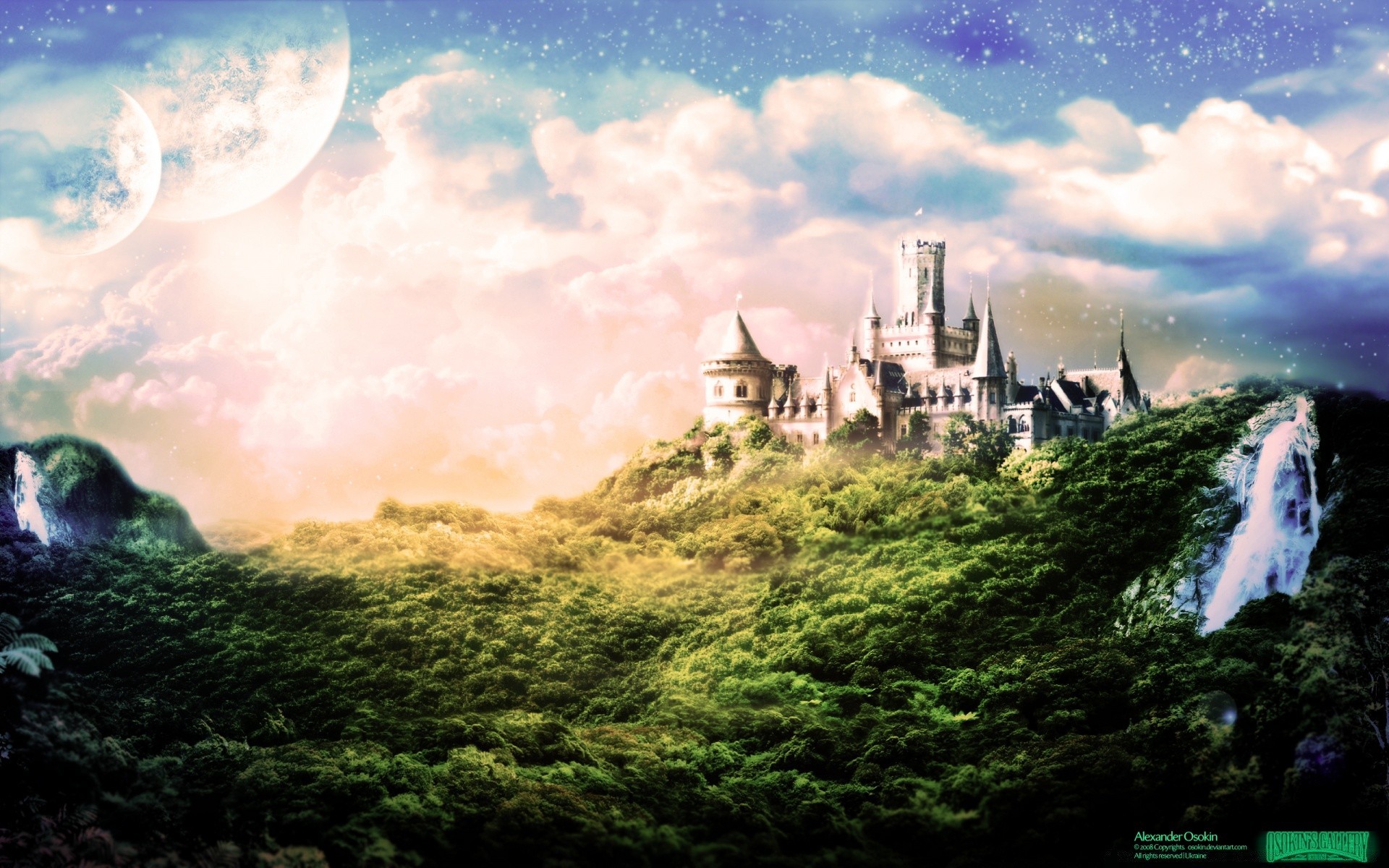 Zamek z wieżą stojący na szczycie skały pod nocnym niebem z księżycem i kometami