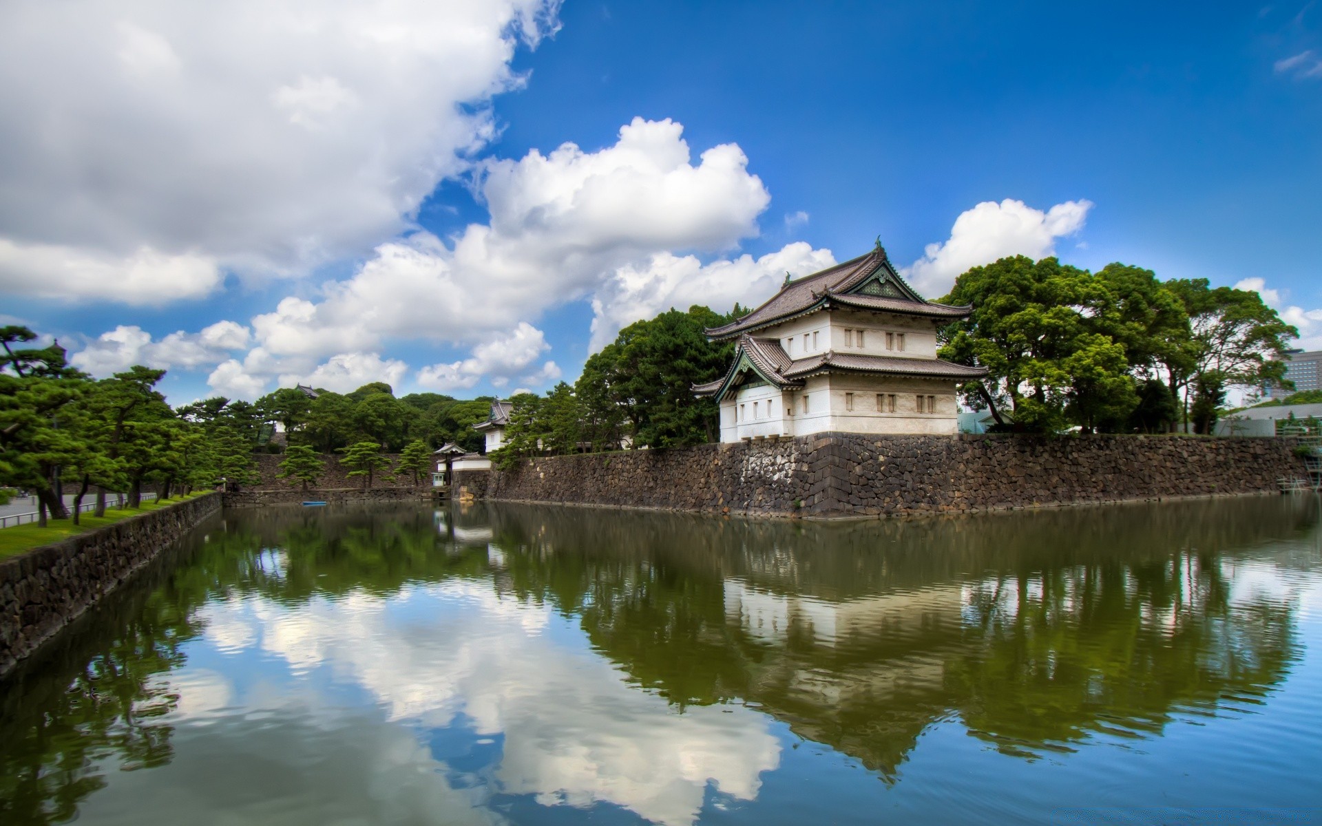 Antyczne budynki z kolumnami błękitne niebo zielone drzewo Droga spacerują ludzie