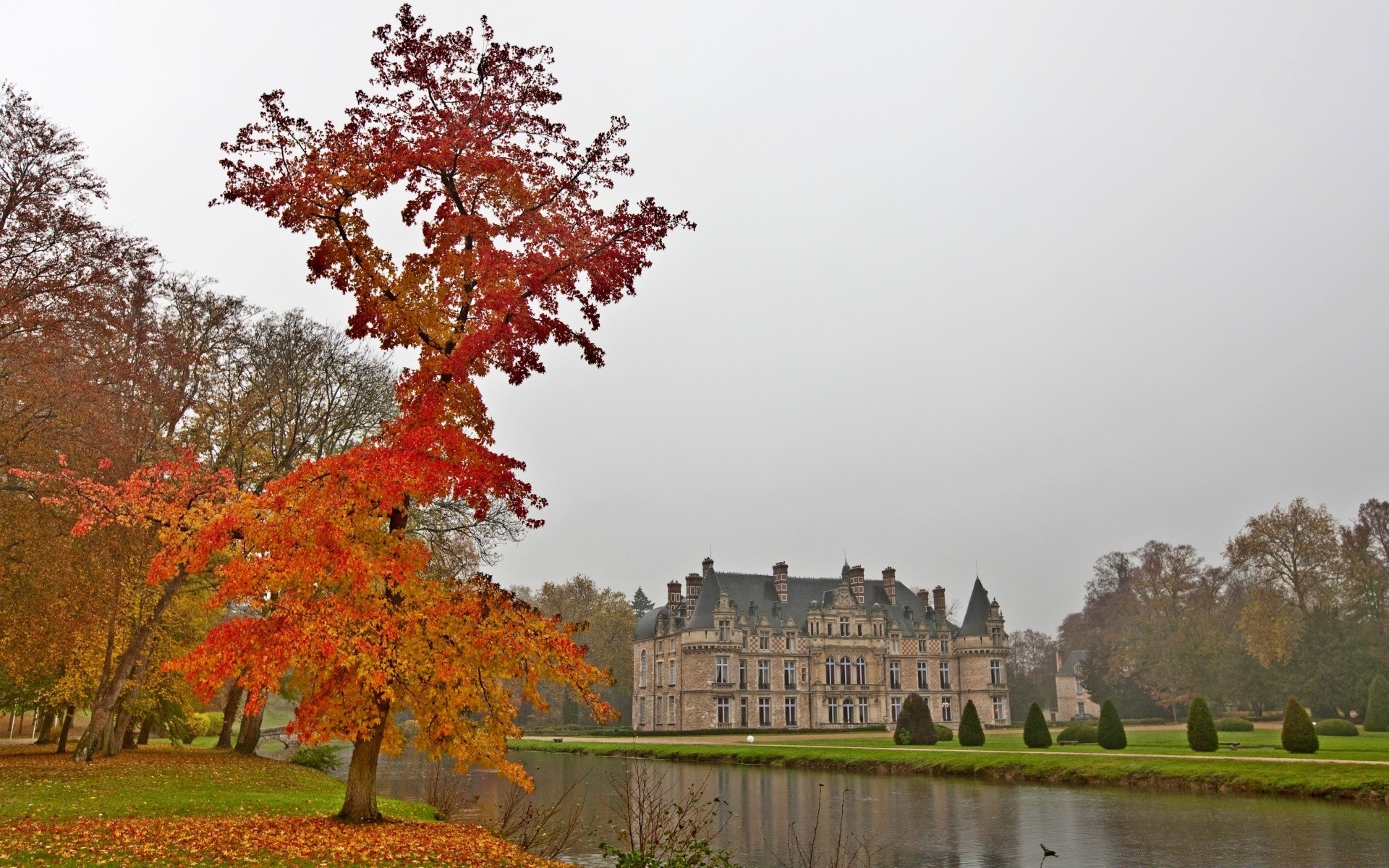 Zabytkowy zamek na jesiennym tle. Jezioro, jeszcze zielona trawa, ale drzewo już w jasnych jesiennych kolorach