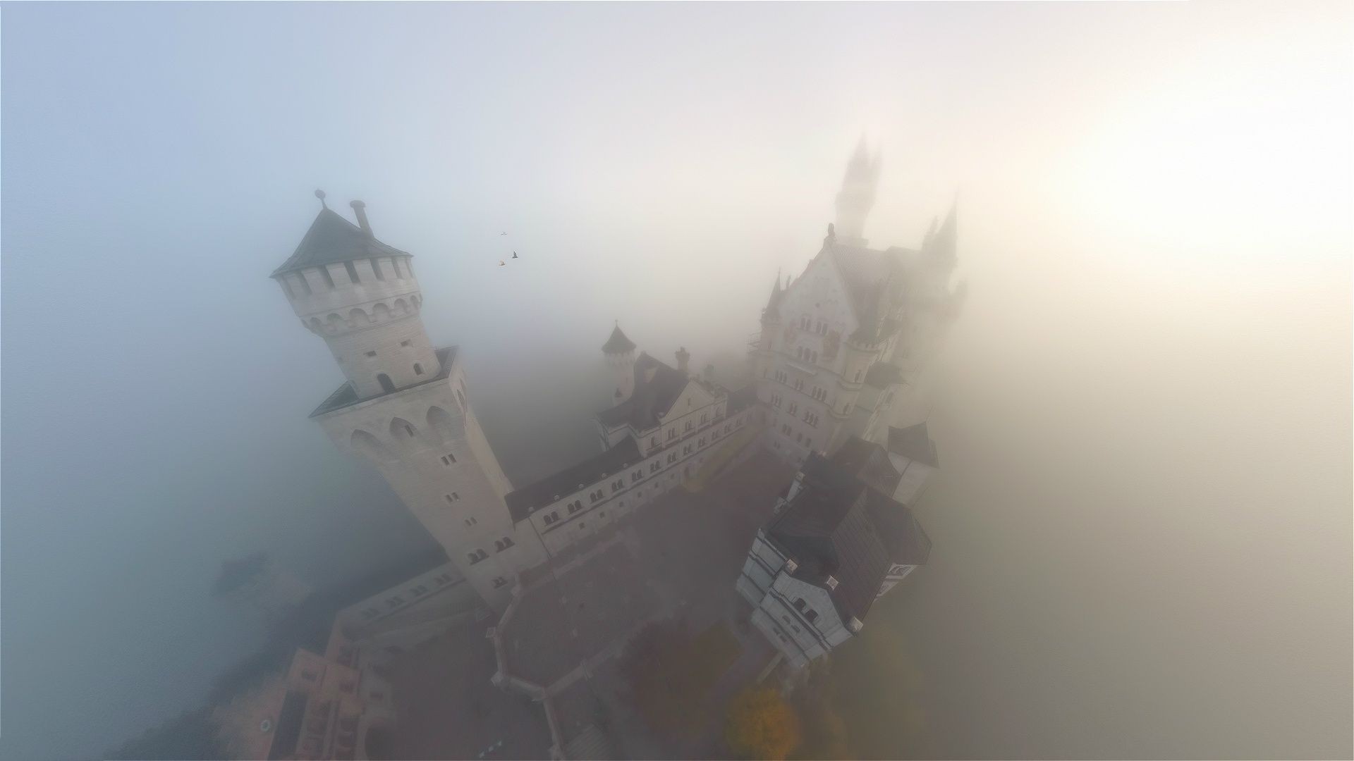 Zamek we mgle. Wyspa we mgle. Bajkowy krajobraz