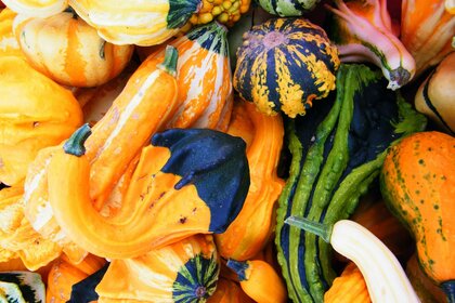 Jesienne zbiory dyń w różnych kolorach