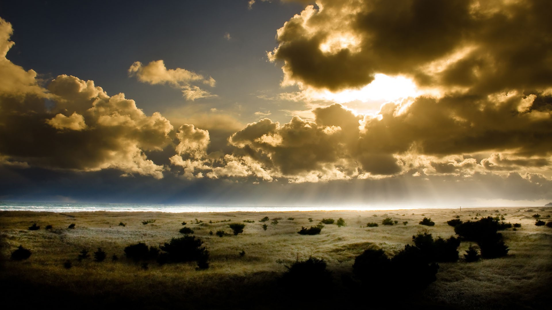 Piaszczysta plaża ze skałami o zachodzie słońca