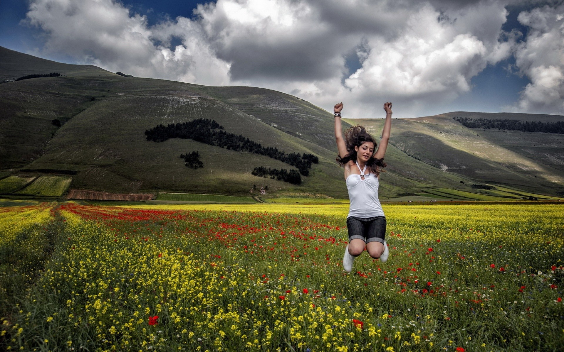 Krajobraz ze skaczącą w polu na tle gór dziewczyna