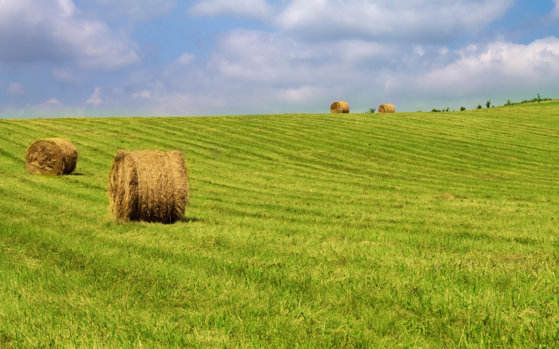 Krajobraz zebranego siana na zielonej trawie