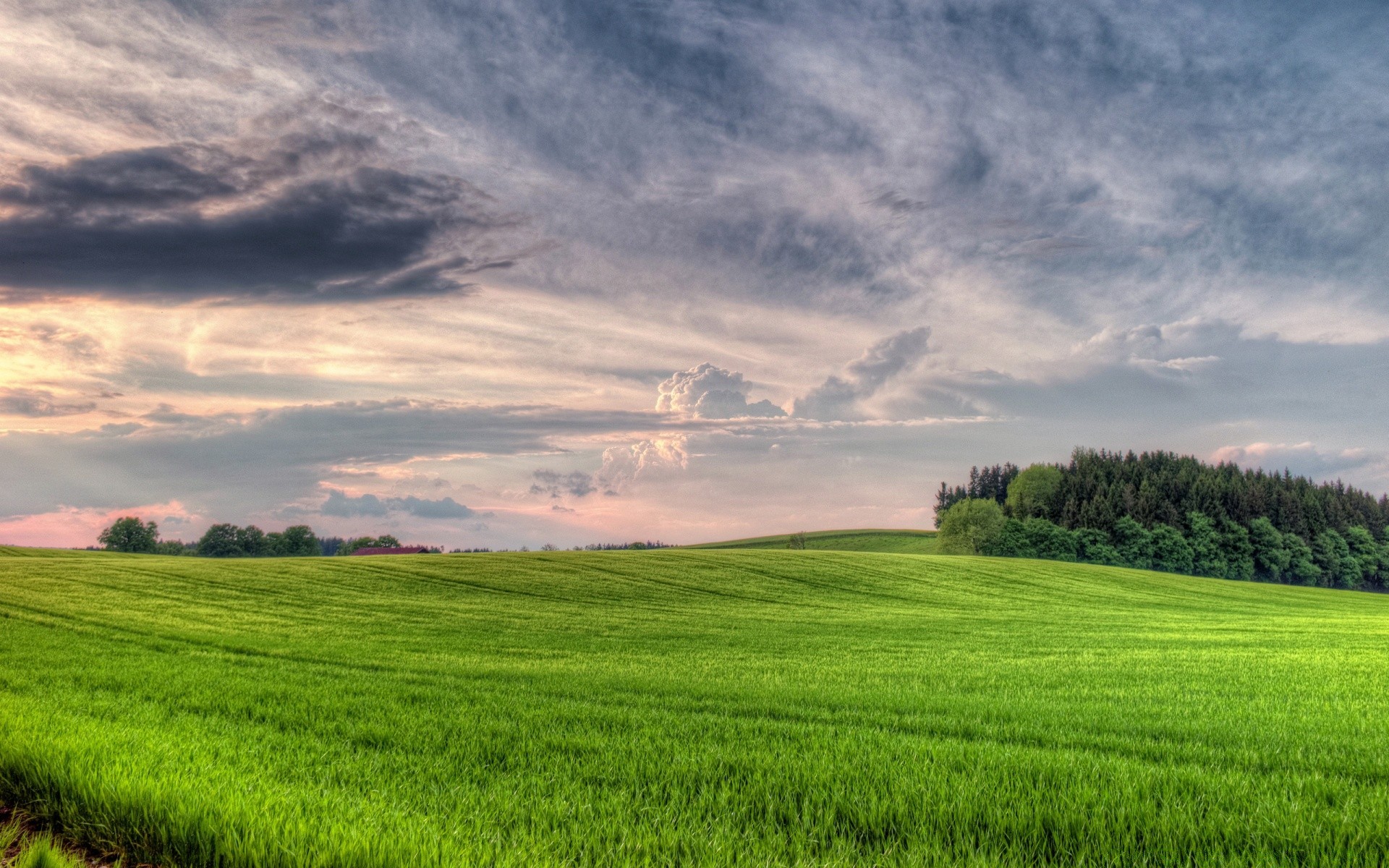 Fioletowe pole, błękitne niebo i zielone przestrzenie