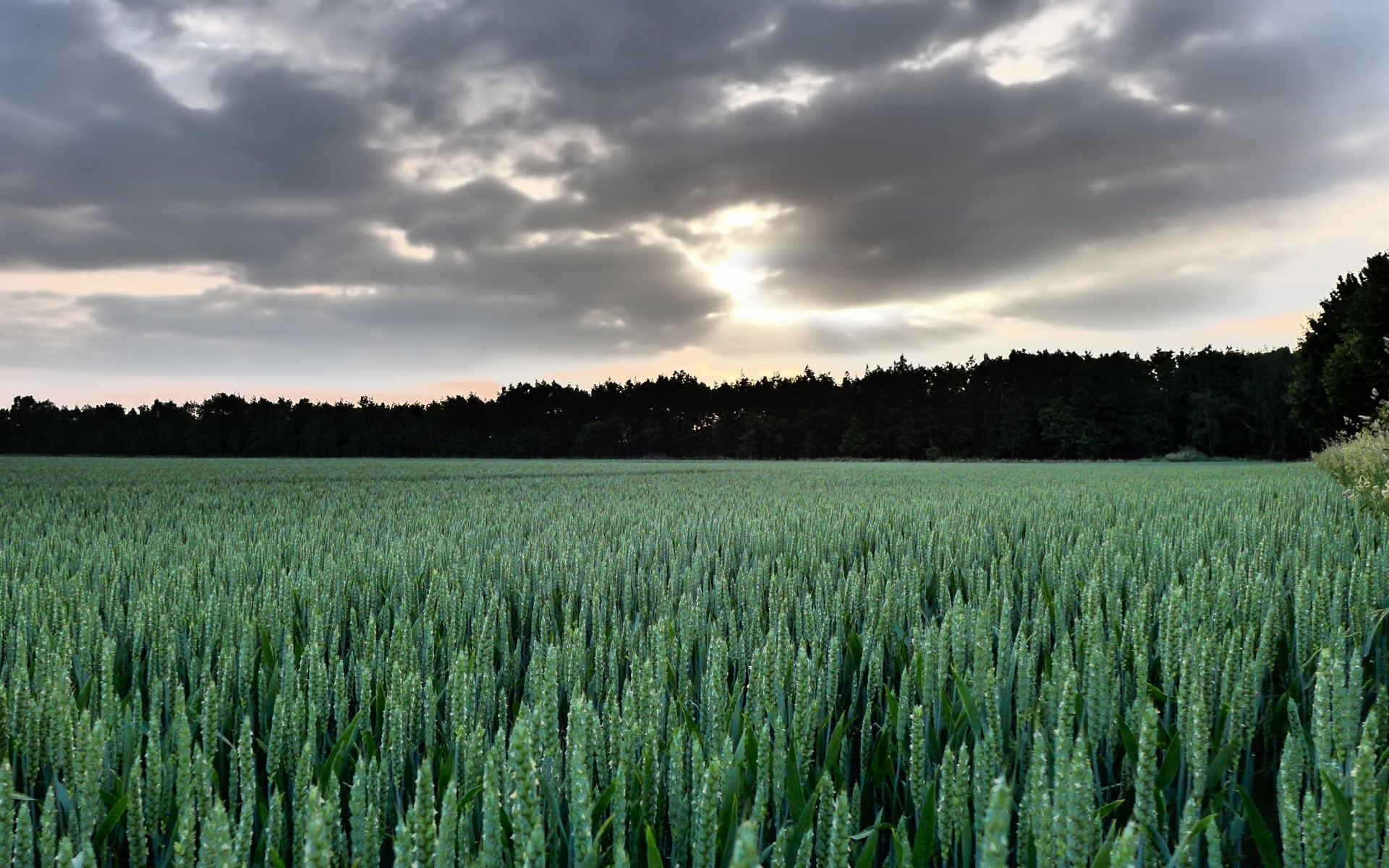 Młoda zieleń pola z widocznym budynkiem mieszkalnym w oddali