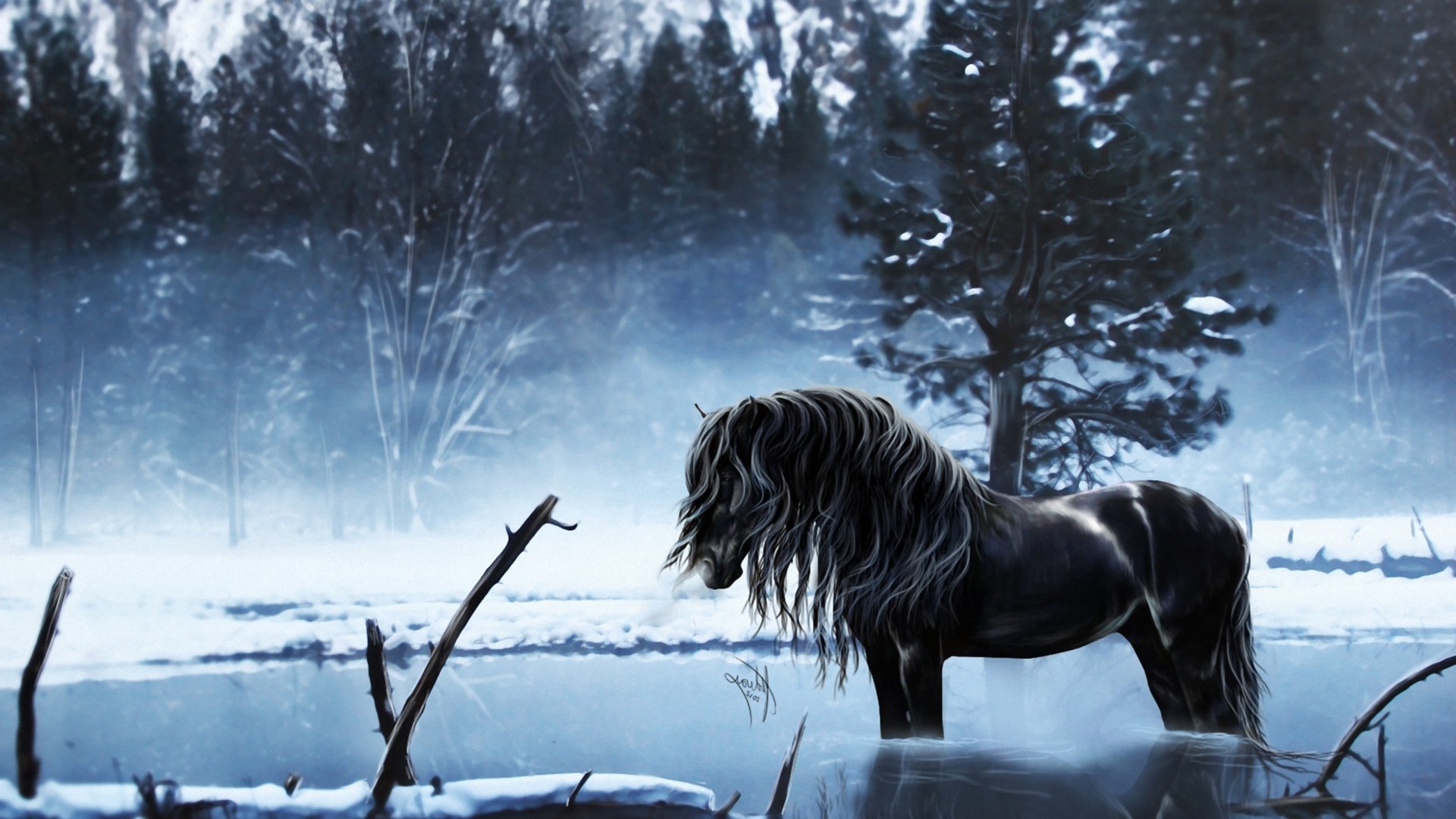 Bajkowy jednorożec w zimowym lesie