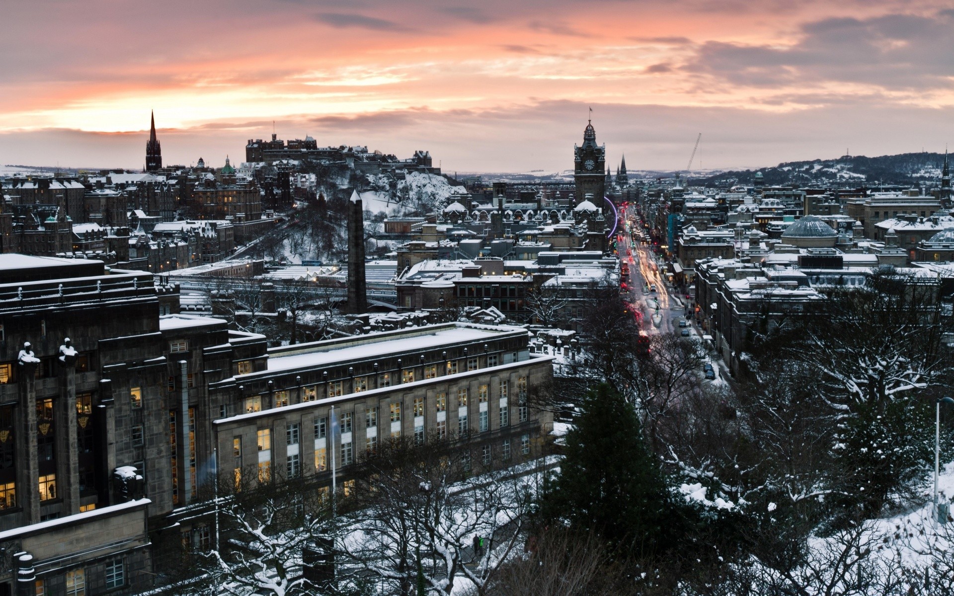 Posterunek kolejowy na tle zachodu Słońca. Zimowy krajobraz