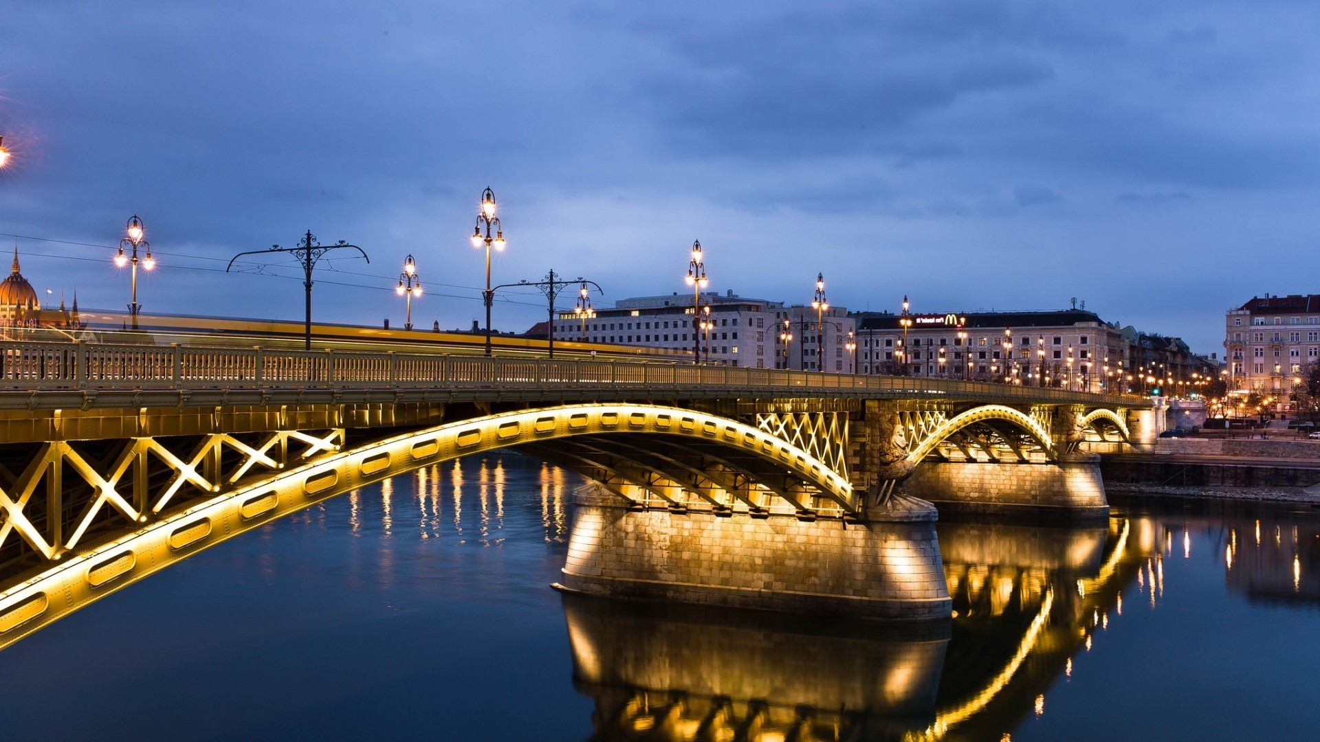 Pół-oświetlony most nad ciemną rzeką