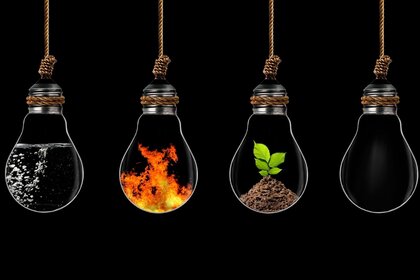 Na czarnym tle cztery szklane żarówki