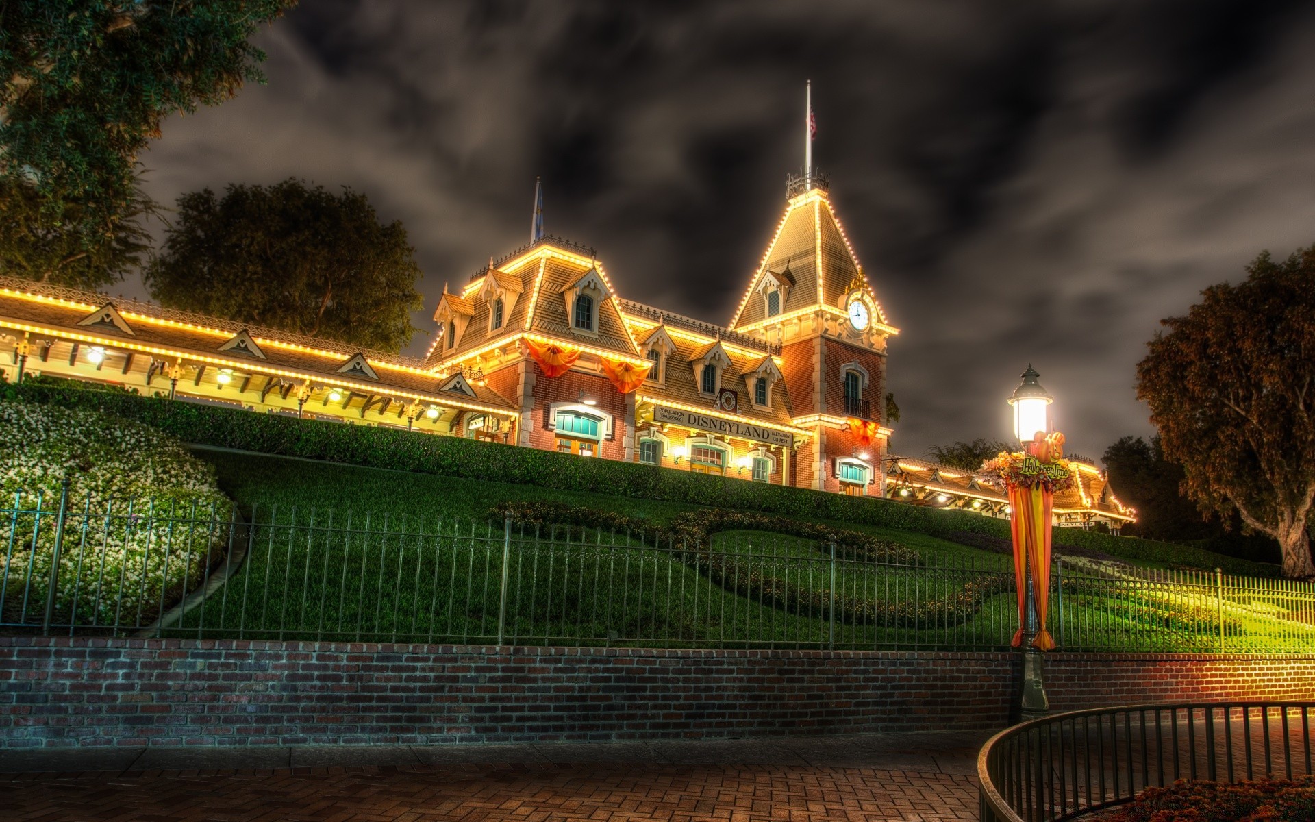 Pejzaż miejski z małymi zaśnieżonymi choinkami